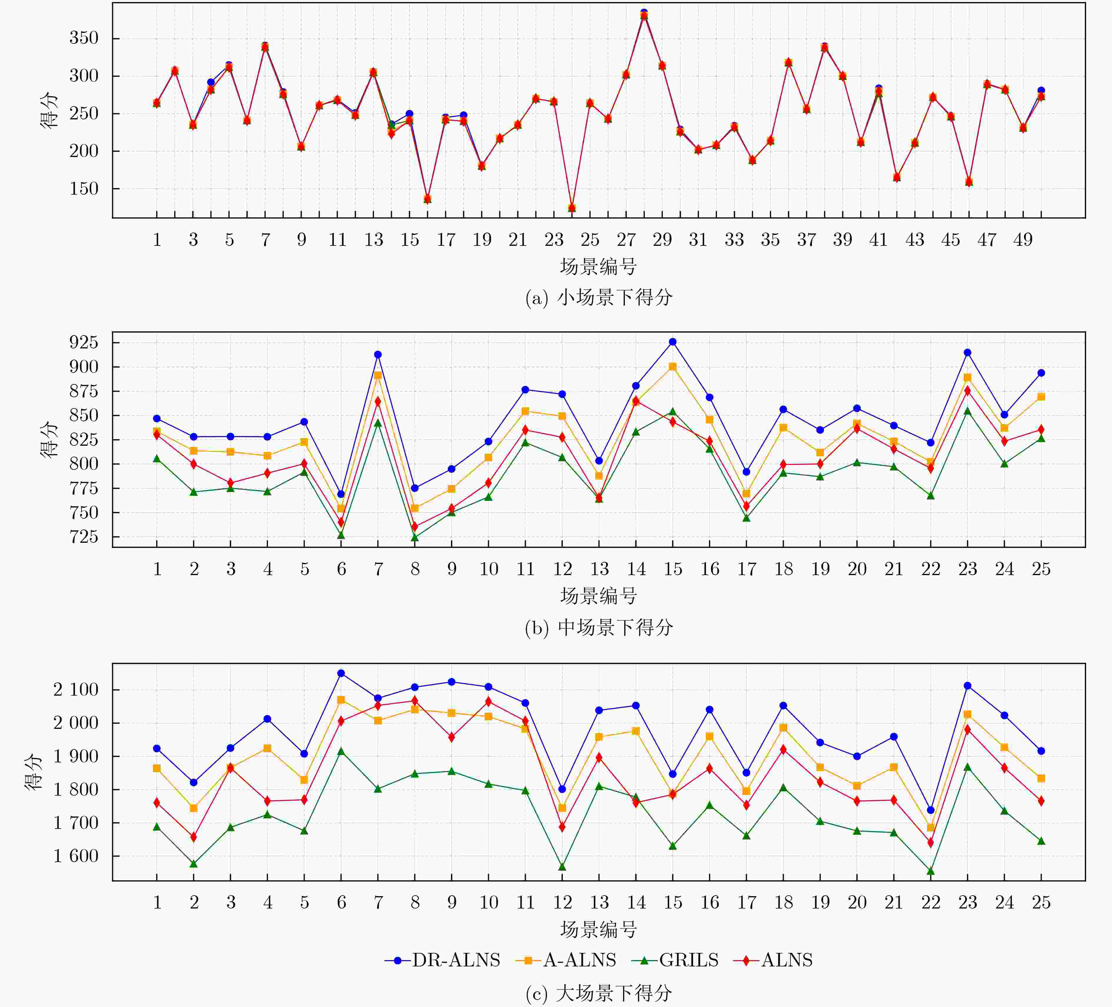算法 小场景平均得分 中场景平均得分 大场景平均得分 DR-ALNS 252.18 845.59 1979.73 ALNS 250.62 820.76 1870.65 A-ALNS 250.54 826.25 1904.31 GRILS 250.66 791.68 1730.04 表 5 各场景中获得最优解迭代次数和运行时间