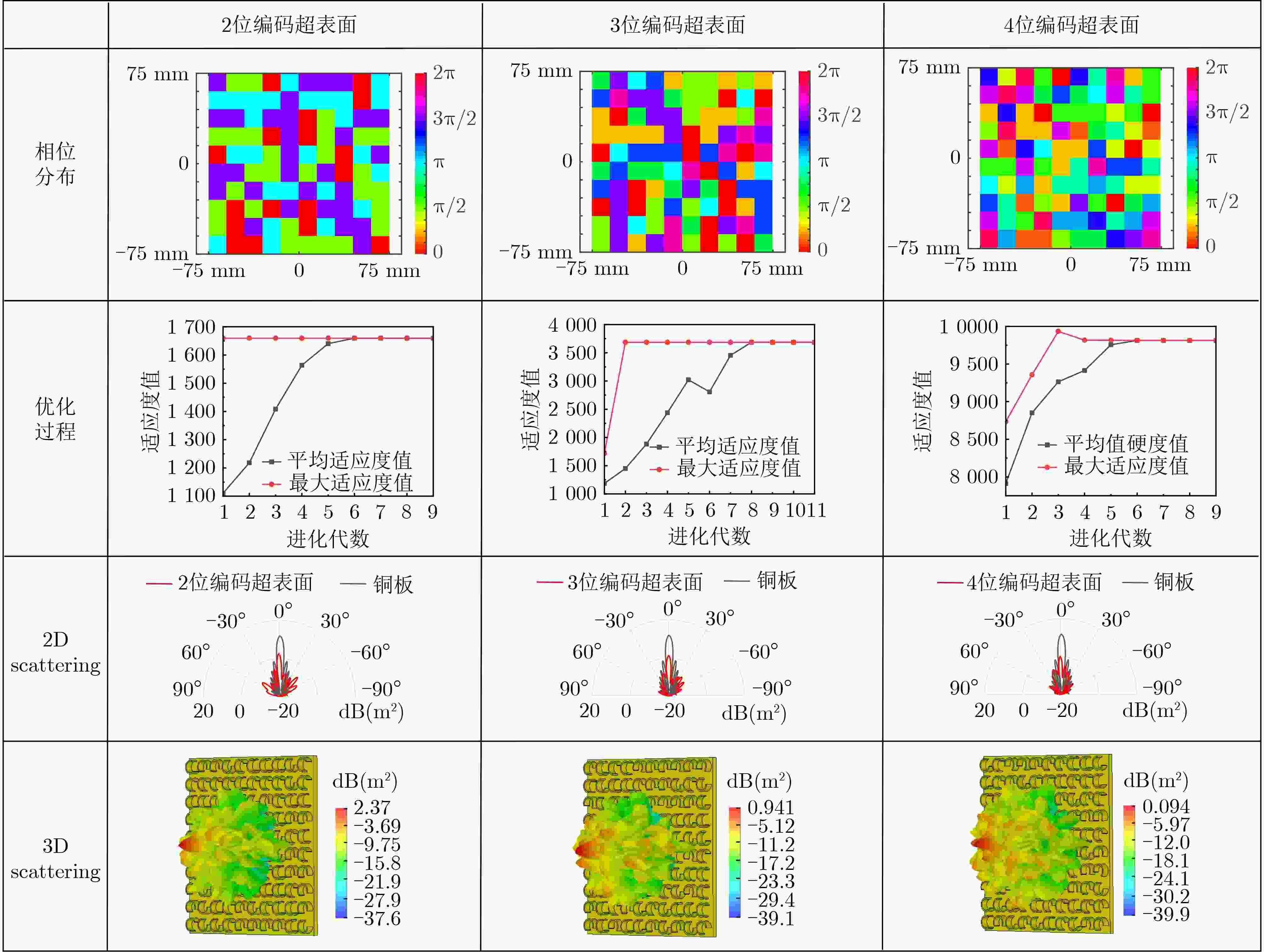 图  6  编码超表面仿真结果的相位分布、算法迭代过程及二维、三维远场散射图。第1列为不同编码超表面的相位分布;第2列为不同编码超表面的算法迭代过程;第3列为14.7 GHz 下不同编码超表面的二维散射图;第4列为 14.7 GHz 下不同编码超表面的三维远场散射图