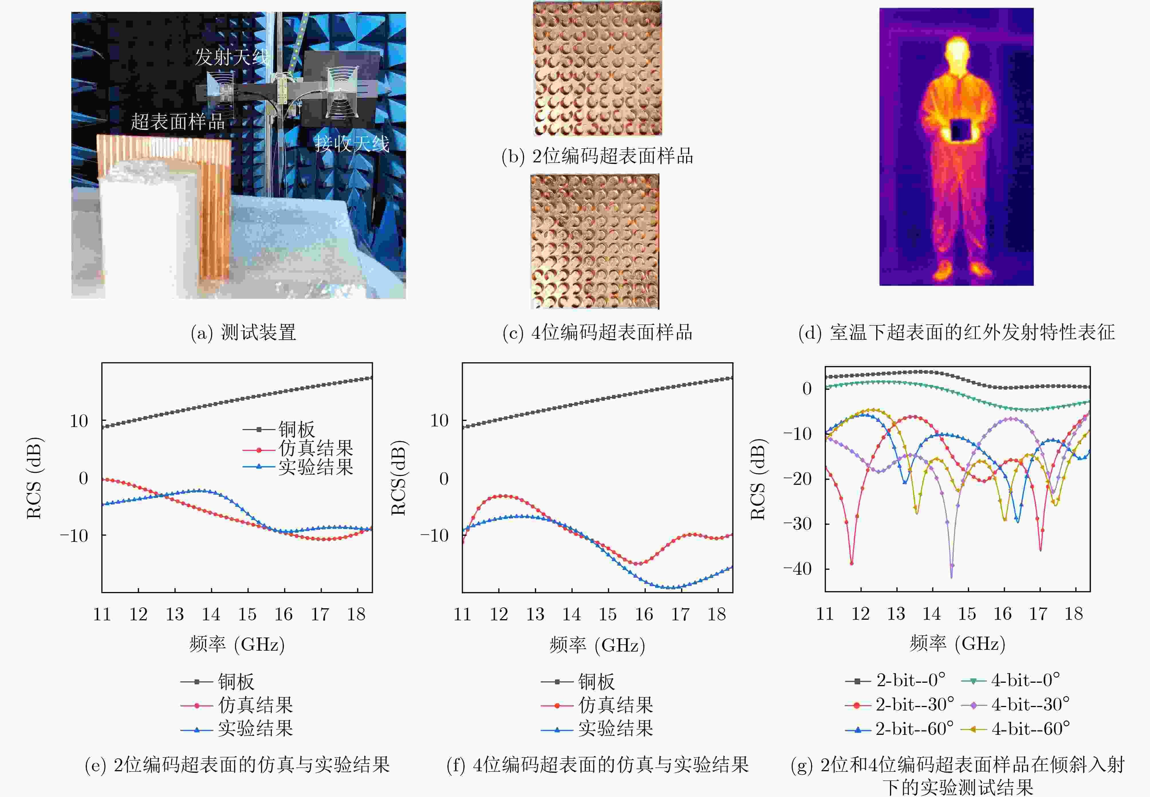• 摘要: 本文通过单一材料平台集成宽带微波散射(7.4 GHz带宽)与被动红外抑制,为跨波段隐身提供了一种解决方案,克服了传统隐身材料同时兼顾微波吸收与热管理之间的设计挑战。本文提出了一种新型全金属随机编码超表面,实现了跨波段隐身功能,兼具微波频段雷达散射截面(radar cross-section, RCS)缩减和红外隐身效果。该超表面整体采用铜结构,通过计算机数控加工制造,相比传统复合材料设计,消除了界面脱层的风险。同时,其单一材料构造使其能够同时调控微波散射特性和红外辐射特性。该结构通过遗传算法优化相位分布后,在11–18.4 GHz频段(73%带宽)内实现了超过10 dB的RCS缩减,在14.7 GHz频点处的最大抑制效果超过15 dB,相关结果已通过仿真和微波暗室测试验证。该全金属结构在8–14 μm红外波段展现出超过99.9%的红外反射率,且通过商业红外成像仪热成像实验证实其被动红外隐身能力,显示出在多光谱隐身应用中的潜力。所制造的CNC原型结构尺寸为150×150 mm2,包含10×10的单元阵列,在最大达60°的线极化斜入射角下仍保持良好的结构稳定性,验证了其在贴合式应用中推广的可行性。
