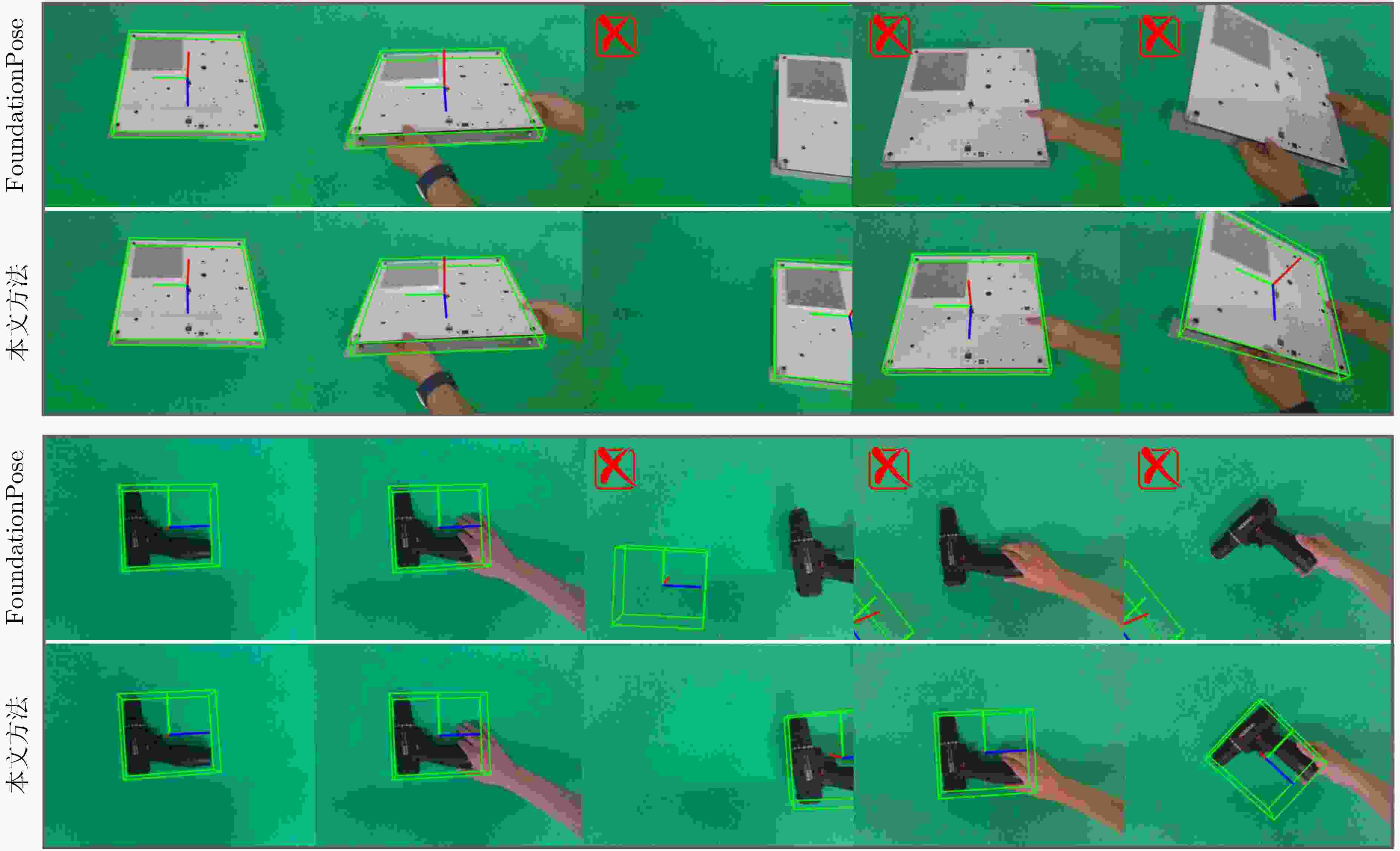 算法 总帧数 成功帧数 TSR/% FoundationPose 视频1 641 502 72 视频2 917 698 视频3 695 428 本文方法 视频1 641 576 85 视频2 917 797 视频3 695 548 表 3 不同模型的对比实验结果