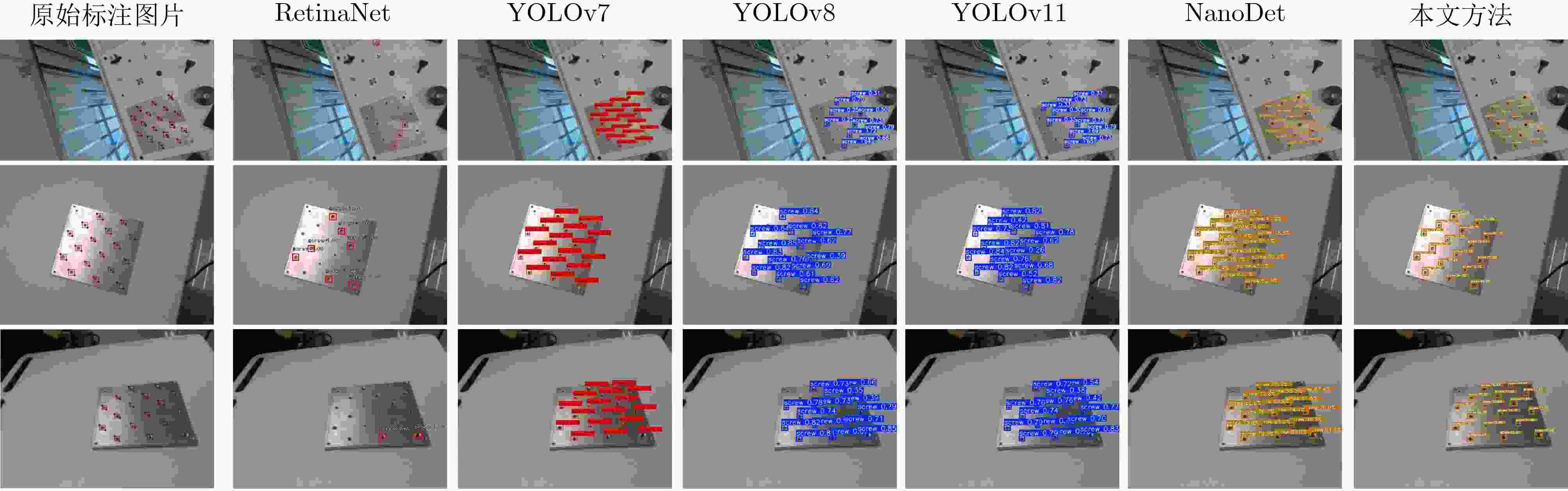 模型 mAP@0.5(%) P(%) R(%) Weights/MB GFLOPs RetinaNet 26.3 98.1 26.6 145.7 34.6 YOLOv7 97.4 96.4 97.2 74.8 13.2 YOLOv8 98.1 98.5 91.4 18.9 6.0 YOLOv11 98.1 98.6 92.8 15.6 4.6 NanoDet 97.5 96.7 98.8 7.6 1.9 本文方法 98.7 98.3 99.2 11.7 2.9 表 4 不同倾角装配性能实验结果