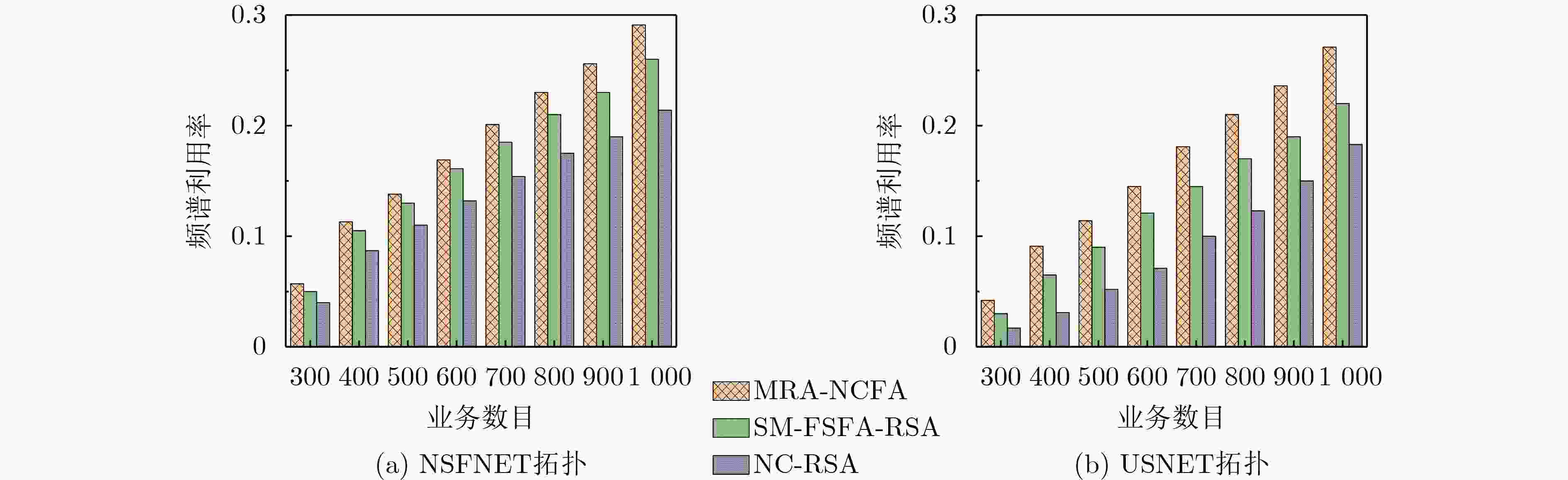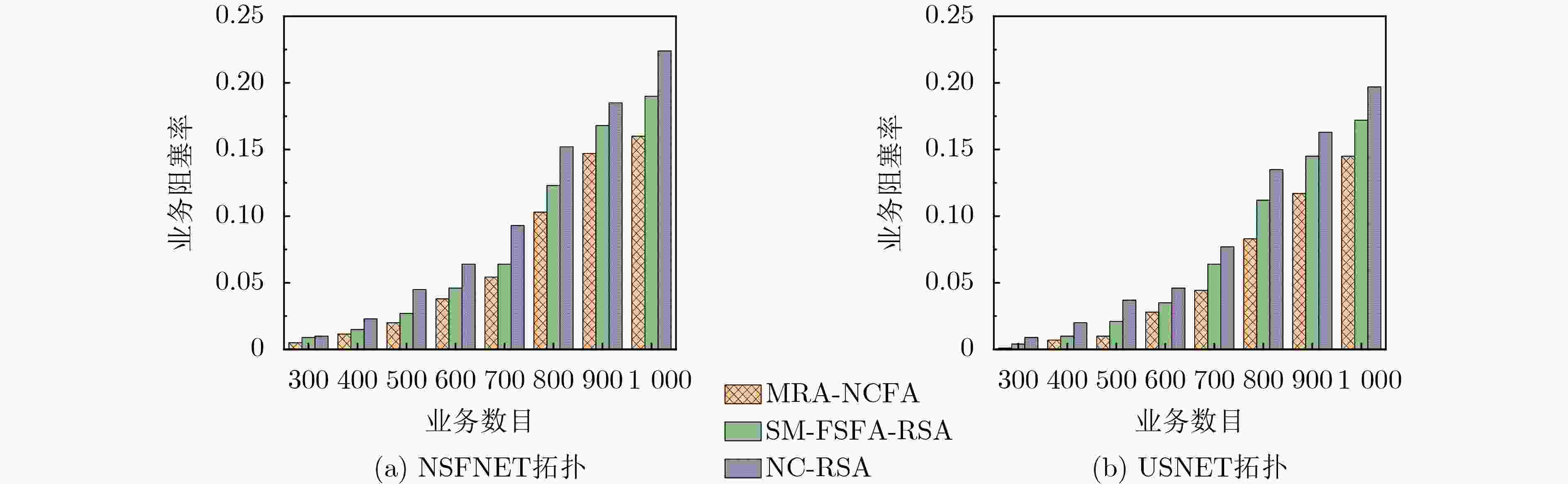 策略1依据路径权重函数值的非机密业务路由选择策略 输入:G(V, E, F),非机密业务r(s, d, B, 0) ,M集合,设置K值; 输出:非机密业务传输路径及其所需FS数。 S1:非机密业务r(s, d, B, 0)到达网络,初始化路径权重函数集合$ W=\varnothing $,转S2; S2:根据EONs拓扑、业务的源节点s、业务的目的节点d,执行最短路径算法,为业务找到K条最短候选路径; S3:根据式(9),计算每条候选路径的路径权重函数值,将其降序存入集合W中; S4:若W为空集,返回业务路由选择失败信息,否则,选择W中第一个路径权重函数对应的路径,作为非机密业务的传输路径; S5:从M中选择路径长度限制的最高调制等级m,由式(8)计算传输业务在该路径上所需FS数$ {N}_{r} $; S6:若传输路径上不存在满足$ {N}_{r} $的可用频谱块,从W中删除该路径,转S4;否则,标志该路径为非机密业务传输路径; S7:输出该非机密业务的传输路径及其所需FS数。 策略2 根据路径代价函数值的机密业务两路径选择策略 输入:G(V, E, F),各链路被窃听的概率值,机密业务r(s, d, B, 1),设置α1值,K值,Np=2; 输出:机密业务传输路径集$ {P}_{\text{cr}} $及其各路径所需FS数。 S1:机密业务r(s, d, B, 1)到达网络,初始化该业务的候选传输路径集$ {P}_{\text{cr}}=\varnothing $、路径代价函数集$ {F}_{C}=\varnothing $; S2:执行最短路径算法,为该业务找到K条最短的候选路径; S3:由式(11),计算机密业务每条候选路径的路径代价函数,将其升序存入集合FC中; S4:选择FC中前两条路径代价函数所对应的路径,标记为$ {p}_{1} $和$ {p}_{2} $,组成机密业务的传输路径集$ {P}_{\text{cr}} $; S5:由式(12),分别计算业务分割在$ {p}_{1} $和$ {p}_{2} $上的带宽值; S6:由式(8),选择路径长度限制的最高调制等级,分别计算业务分割带宽在$ {p}_{1} $和$ {p}_{2} $所需FS数; S7:若$ {p}_{1} $和$ {p}_{2} $上不存在满足机密业务FS需求的频谱块,从$ {P}_{\text{cr}} $中删除不满足业务带宽需求的路径,转S8,否则,转S9; S8:若$ {F}_{C} $所有候选路径的两两组合都不满足机密业务FS要求,结束策略2,执行策略3;否则,将$ {F}_{C} $中下一条候选路径加入$ {P}_{\text{cr}} $中,转S5; S9:输出机密业务的两条传输路径集$ {P}_{\text{cr}} $及在该各子路径上所需FS数。 策略3根据路径代价函数的机密业务三路径选择策略 输入:G(V, E, F),各链路被窃听的概率值,机密业务r(s, d, B, 1),设置α1和K值,Np=3; 输出:机密业务传输路径集$ {P}_{\text{cr}} $及其各路径所需FS数。 S1:业务r(s, d, B, 1)到达网络,初始化业务传输路径集$ {P}_{\text{cr}}=\varnothing $、路径代价函数集$ {F}_{C}=\varnothing $; S2:执行最短路径算法,为业务找到K条最短候选路径; S3:由式(11),计算机密业务在每条候选路径的路径代价函数,将其升序存入集合FC中; S4:选择FC中前三个路径代价函数所对应的路径,标记为$ {p}_{1} $、$ {p}_{2} $和$ {p}_{3} $,组成机密业务的传输路径集$ {P}_{\text{cr}} $; S5:由式(12),分别计算业务分割在$ {p}_{1} $、$ {p}_{2} $和$ {p}_{3} $上的带宽值; S6:由式(8),采用路径长度限制的最高调制等级,分别计算业务分割带宽在$ {p}_{1} $、$ {p}_{2} $和$ {p}_{3} $所需FS数; S7:若$ {p}_{1} $、$ {p}_{2} $和$ {p}_{3} $上不存在满足机密业务FS需求的频谱块,从$ {P}_{\text{cr}} $中删除不满足需求的路径,转S8;否则,转S9; S8:若枚举$ {F}_{C} $中所有候选路径组合,均不满足机密业务FS要求,返回路径选择失败信息;否则,将$ {F}_{C} $中下一条候选路径加入$ {P}_{\text{cr}} $中,