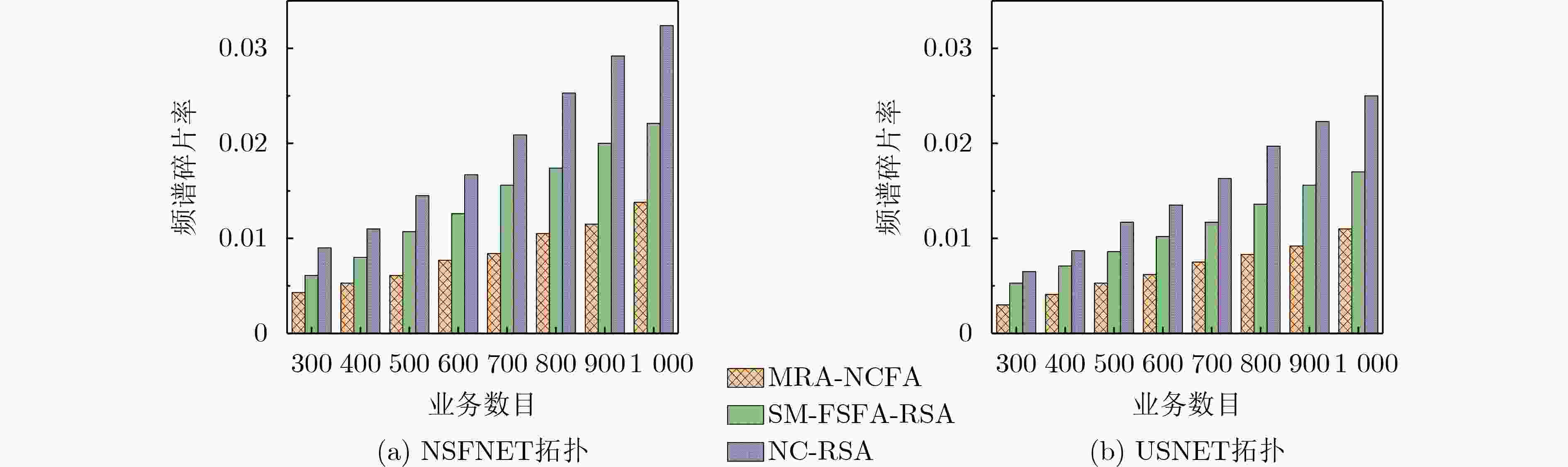 Objective Each fiber in Elastic Optical Networks (EONs) provides enormous bandwidth capacity and carries a large amount of services and data. Even if one of elements in EONs is eavesdropped or attacked in a short period of time, it will cause a large amount of data leakage or loss, resulting in a significant decrease in network performance. At the same time, more and more confidential are more sensitive to data leakage or loss on the path, and network attacks will damage the date of a large number of confidential services. Network Coding (NC) combines data from different services through XOR operation and transmits them over EONs. Then, it performs decoding operation at the receiving end to recover the original data information, opening up a new idea to avoid data eavesdropping on the path. However, the condition for NC is that there are encryption constraints in the EONs where the routing and Frequency Slot (FS) allocation of other services overlap with the routing and FS of the confidential service to be encrypted. Therefore, the routing and spectrum allocation of confidential services need to consider network coding constraints and the efficiency of routing and spectrum resource allocation. Methods A Multi-Path Resource Allocation based on Network Coding and Fragmentation Aware (MRA-NCFA) method is proposed to address the security and reliable transmission for confidential services in response to eavesdropping attacks. Firstly, the MRA-NCFA method uses network coding for data encryption in terms of services security, and employs the multi-path protection method for reliable services transmission. Secondly, in the routing stage, for non-confidential services, the focus is on balancing network payload and improving network resource utilization. So, a path weight function for non-confidential services is mainly designed based on path payload. And a path weight function includes the path hop, maximum idle spectrum block on the path, and the required FS of the service. The path corresponding to the maximum value of this function is selected as the transmission path for non-confidential services. For confidential services, in the routing selection stage, emphasis should be placed on whether information has been leaked, while also considering the availability of path resources. Therefore, a path cost function based on eavesdropping probability and a routing strategy considering eavesdropping probability have been designed. Finally, in the resource allocation stage, the purpose of non-confidential services is to maximize network spectrum efficiency. And it is necessary to avoid the generation of spectrum fragments as much as possible and maintain the continuity and consistency of resources. To this end, we have designed a fragment-sensing spectrum allocation strategy for non-confidential services. Through the designed fragment measurement formula, we measure the impact of service resource allocation on link resources. For confidential services, considering the constraints of encrypted transmission and FS matching, a spectrum allocation strategy based on FS and fragment sensing functions has been designed. This FS and fragment sensing function not only consider the impact of resource fragments, but also the impact of established services resources, providing high security for confidential services. Results and Discussions The proposed MRA-NCFA algorithm can get the lowest service blocking probability ( Figure 2 ) because both confidential and non-confidential services consider the impact of path resources in routing selection, and the impact of fragmentation is also taken into account in resource allocation, which can leave idle resources for subsequent services as much as possible. In addition, confidential services also adopt multi-path transmission methods, which can divide larger services into multiple sub services, which is conducive to the utilization of spectrum resources. With the increase of services, the spectrum utilization of MRA-NCFA algorithm has significantly improved. This is because the algorithm adopts multi-path transmission method, which can divide large services into small services and effectively utilize some small spectrum fragments. In addition, confidential and non-confidential services not only consider the number of resources in the path in routing selection, but also choose the path with less spectrum consumption. When allocating resources, both services consider the impact of fragments, avoiding the generation of fragments on the path and thus improving spectrum utilization (Figure 3 ). As the number of services increases, compared to other two algorithms, the proposed MRA-NCFA algorithm has the slowest and smallest increase in spectrum fragmentation ratio. This is because the MRA-NCFA algorithm adopts multi-path transmission method and fragment-sensing resource allocation method, which can improve the utilization of small-sized spectrum resource fragments and reduce the spectrum fragmentation ratio in EONs. Moreover, both confidential and non-confidential services consider the impact of fragmentation in resource allocation and take measures to reduce fragmentation rates. Therefore, its performance is better than that of compared Survivable Multipath Fragmentation-Sensitive Fragmentation-Aware Routing and Spectrum Assignment (SM-FSFA-RSA) and (Network Coding based Routing and Spectrum Allocation, NC-RSA) algorithms (Figure 4 ).Conclusions The resource allocation of protecting services against eavesdropping attacks in elastic optical networks is studied to guarantee the requirements of confidential services and reduce spectrum fragmentation. The MRA-NCFA is proposed. The MRA-NCFA algorithm employs network coding to encrypt confidential services and adopts multi-path protection to safeguard confidential services. For non-confidential services, a path weight function based on path resources is designed to select routes, and spectrum fragment metric values based on fra