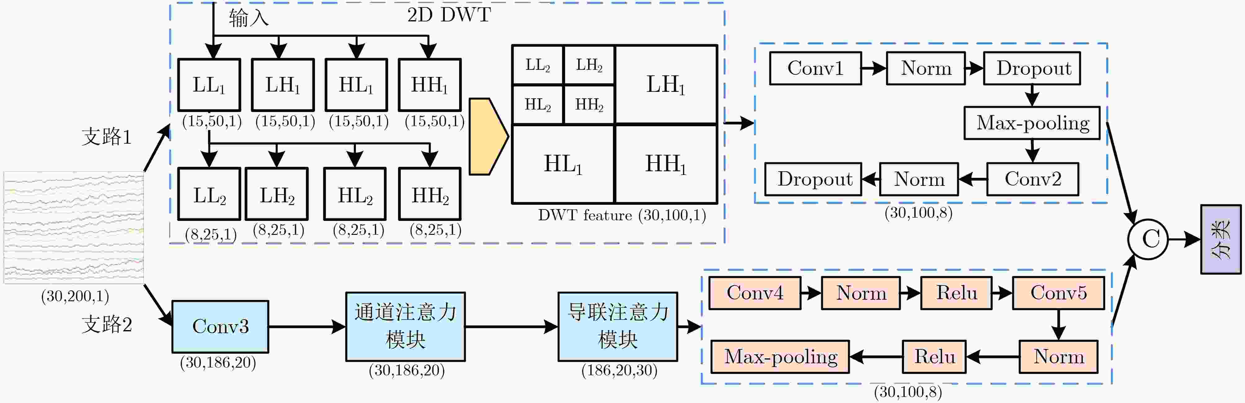 摘要: 虚拟现实晕动症(VRMS)指在虚拟现实(VR)环境中用户因前庭-视觉信息失调引发的严重眩晕,该症状阻碍沉浸式VR技术应用和推广。该文提出一种小波变换与注意力机制协同的双路融合模型(WTATNet),通过解耦VR运动刺激暴露后的休息态脑电(EEG)的时空特征,为VRMS的客观检测提供新方法。该模型分为两条支路,支路1对EEG时间维和导联维进行二维离散小波变换计算出小波系数,再将小波系数送入卷积层进行特征提取。支路2则是EEG经过一维卷积层滤波后,依次利用通道注意力模块和导联注意力模块强化通道维和导联维的关键特征。最后将两支路的特征融合并进行分类。该文使用VR游戏《超级滑翔翼2》诱发受试者的VRMS并记录他们在任务前后的休息态EEG评估WTATNet模型的性能,最终实现对受试者休息态下眩晕脑电与非眩晕脑电的分类。该模型对VRMS的识别准确率、F1-score、精确率和召回率(十折交叉验证的平均值)分别为98.39%, 98.39%, 98.38%和98.40%,优于目前的先进的EEG识别模型。结果表明所提方法可对VRMS进行检测,并用于进一步研究VRMS的产生因素和治理方法,对优化VR系统具有一定的指导意义。Abstract: