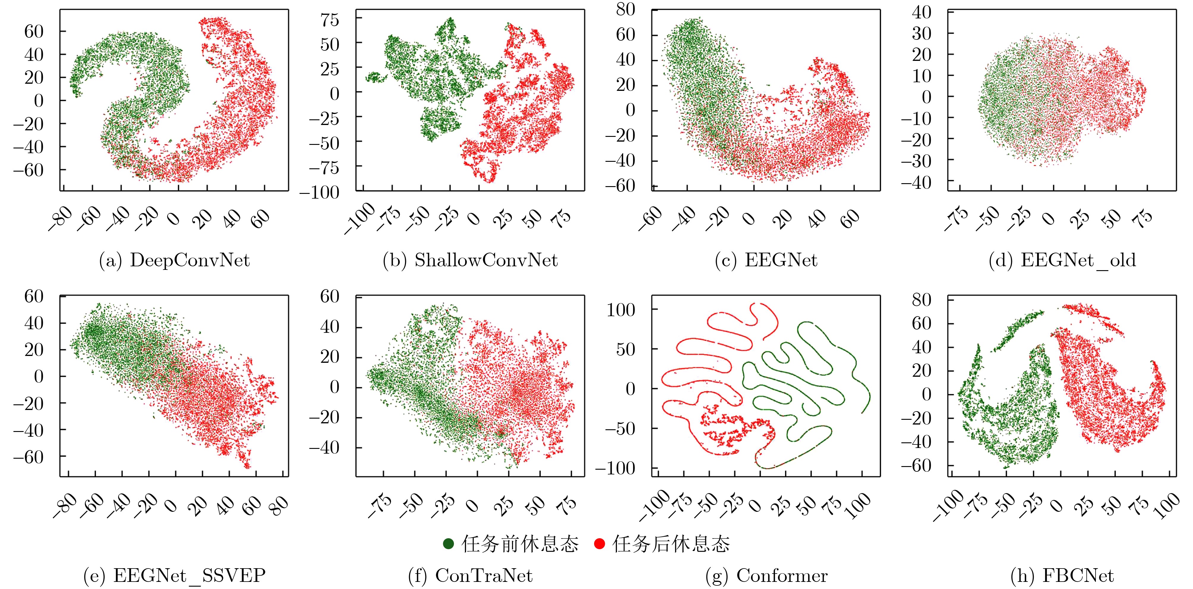 模型/指标 accuracy F1 precision recall WTATNet(本文) 98.39±0.56 98.39±0.53 98.38±0.53 98.40±0.52 DeepConvNet 67.49±6.03 64.00±8.13 68.12±5.88 78.98±2.73 ShallowConvNet 95.55±4.03 95.49±4.13 95.44±4.20 96.14±3.16 EEGNet 72.40±4.45 70.76±5.32 72.91±4.08 79.56±2.34 EEGNet_old 67.78±3.73 65.04±4.98 68.32±3.58 76.79±2.08 EEGNet_SSVEP 79.25±4.59 78.58±4.92 79.59±4.42 83.68±2.91 ConTraNet[33] 84.97±6.05 84.66±6.57 85.09±6.03 96.82±3.75 Conformer[34] 93.34±2.28 93.32±2.29 93.42±2.24 93.84±1.86 FBCNet[35] 98.04±0.92 98.03±0.93 98.02±0.95 98.08±0.82 表 3 电极横向排序下模型消融实验结果(平均值±标准差)(%)