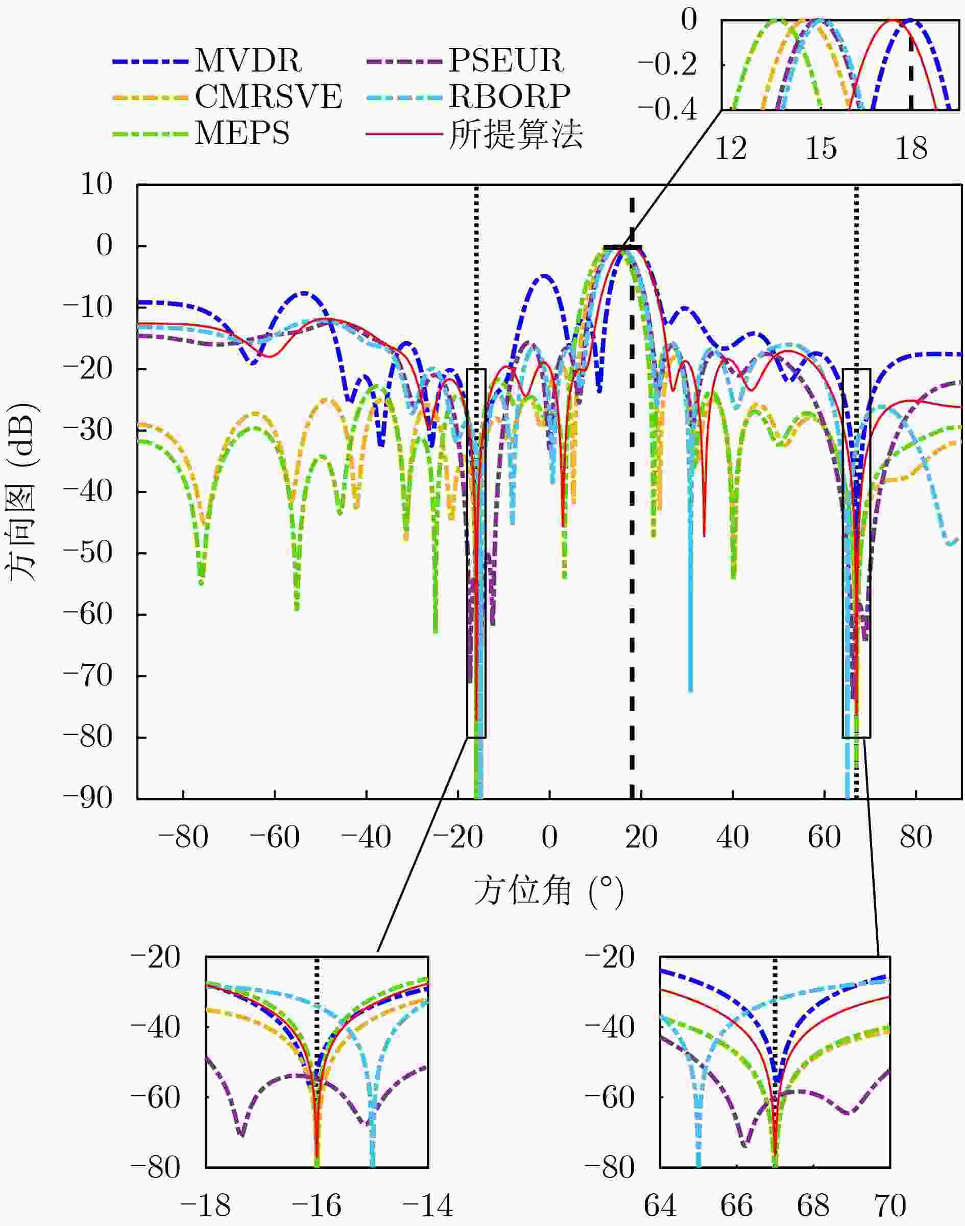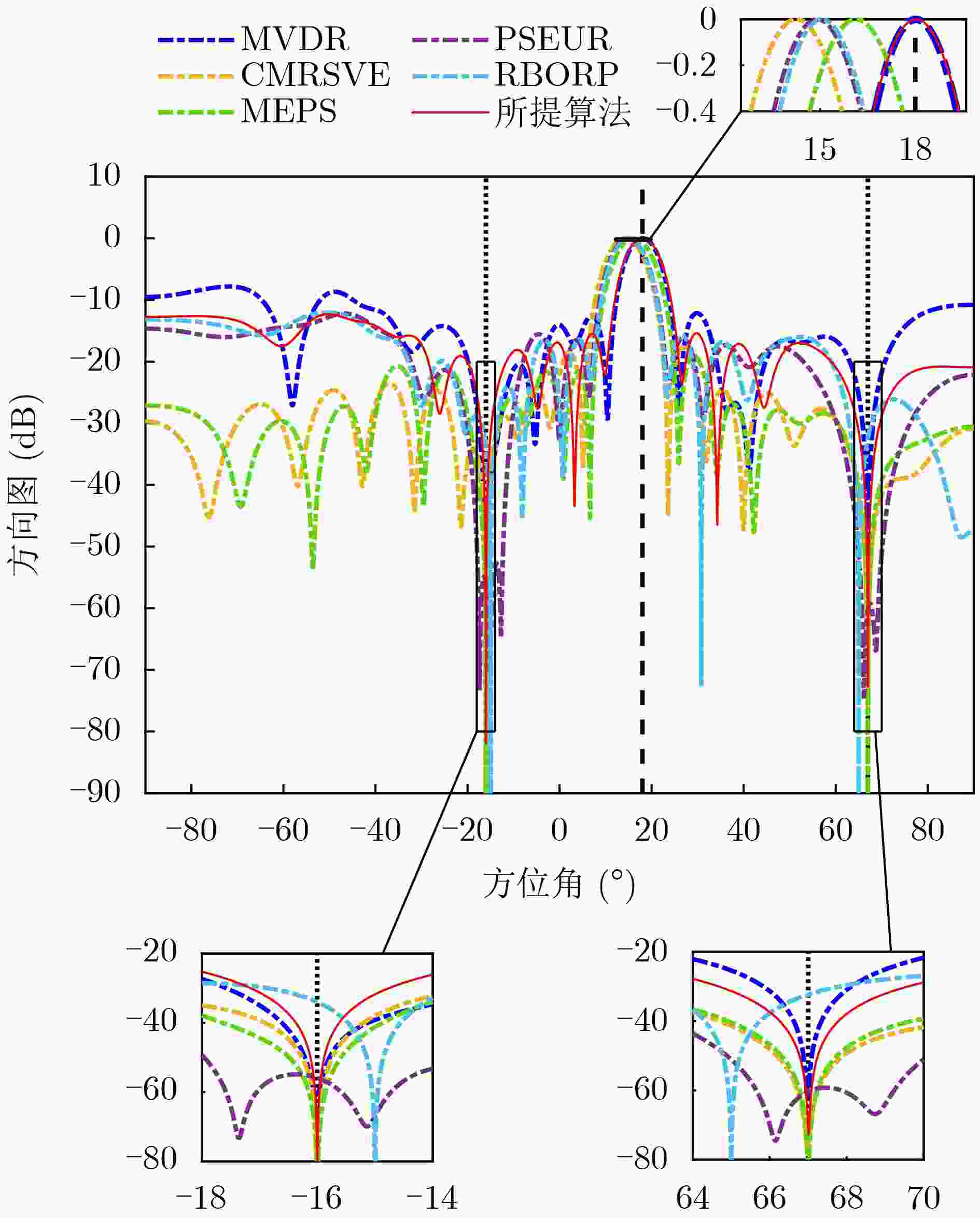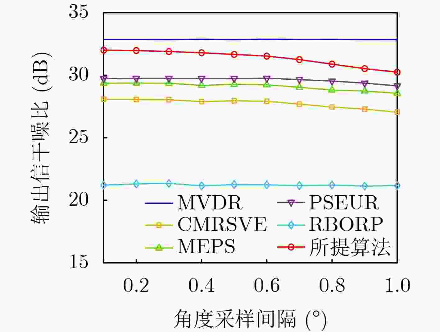 $ \boldsymbol{G}=[{\boldsymbol{u}}_{1},{\boldsymbol{u}}_{2},\cdots ,{\boldsymbol{u}}_{{{T}_{0}}}] $;5:得到正交投影矩阵$ \boldsymbol{P}_{\boldsymbol{G}}^{\bot }=\boldsymbol{I}-\boldsymbol{G}{({{\boldsymbol{G}}^{\mathrm{H}}}\boldsymbol{G})}^{-1}{\boldsymbol{G}}^{\mathrm{H}} $; 6:在期望信号角扇区$ {\varTheta }_{\text{s}} $内进行Capon功率谱积分构造矩阵$ \tilde{\boldsymbol{R}} $; 7:对矩阵$ \tilde{\boldsymbol{R}} $进行特征值分解$ \tilde{\boldsymbol{R}}=\boldsymbol{V}\boldsymbol{Z}{\boldsymbol{V}}^{\mathrm{H}} $,并估计期望信号导