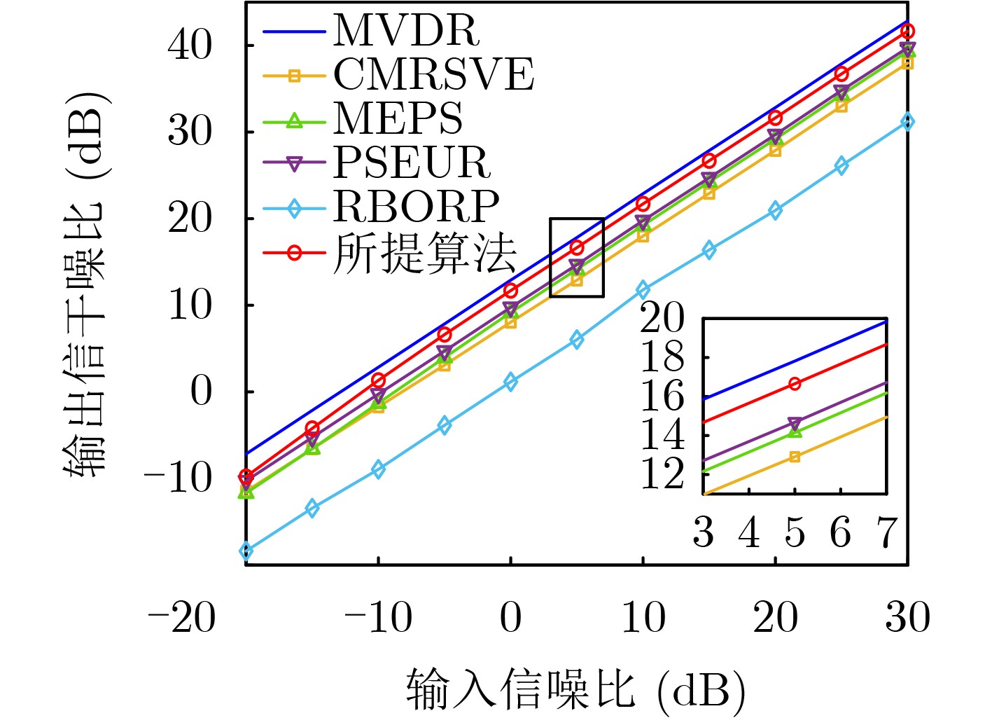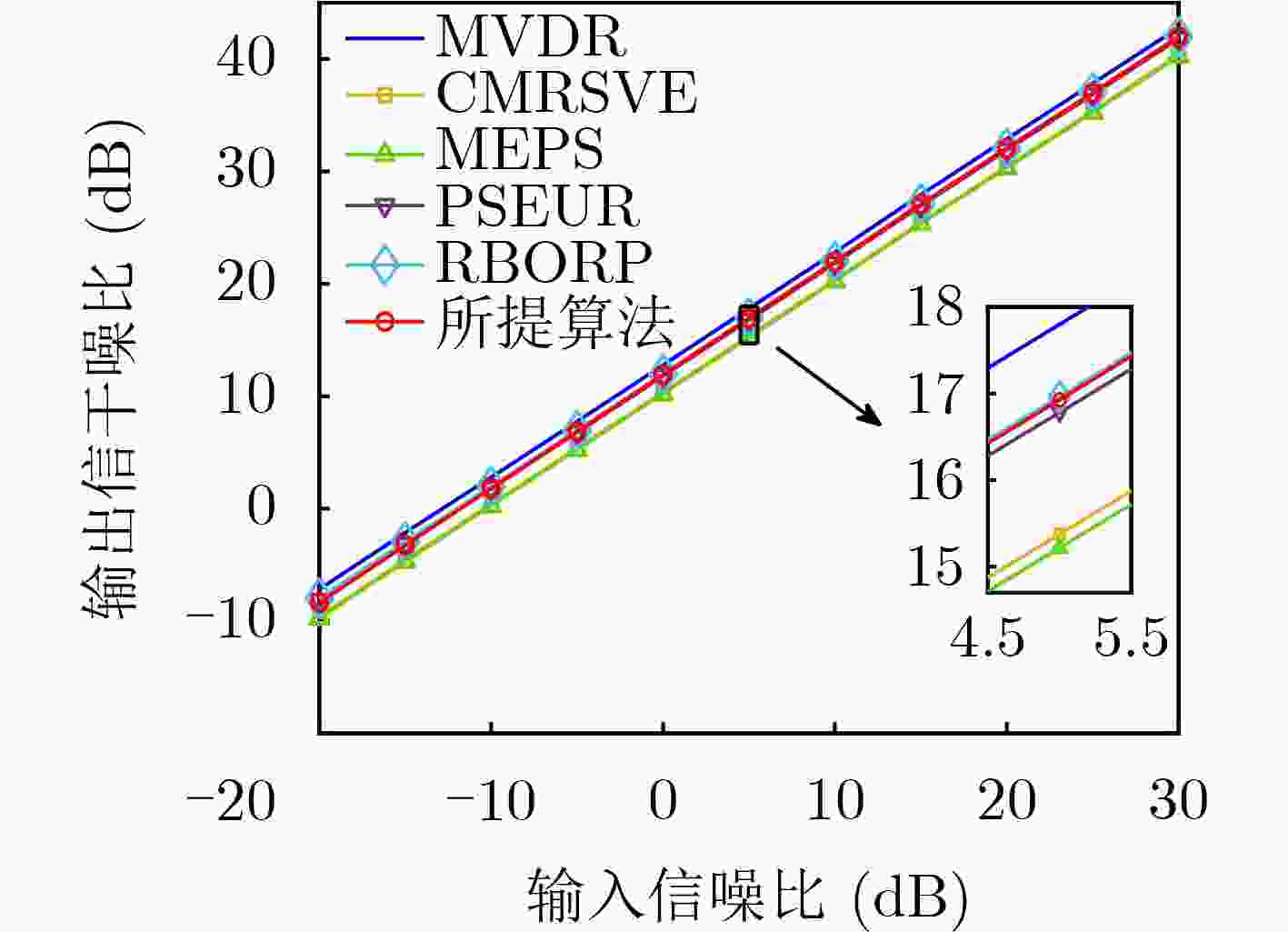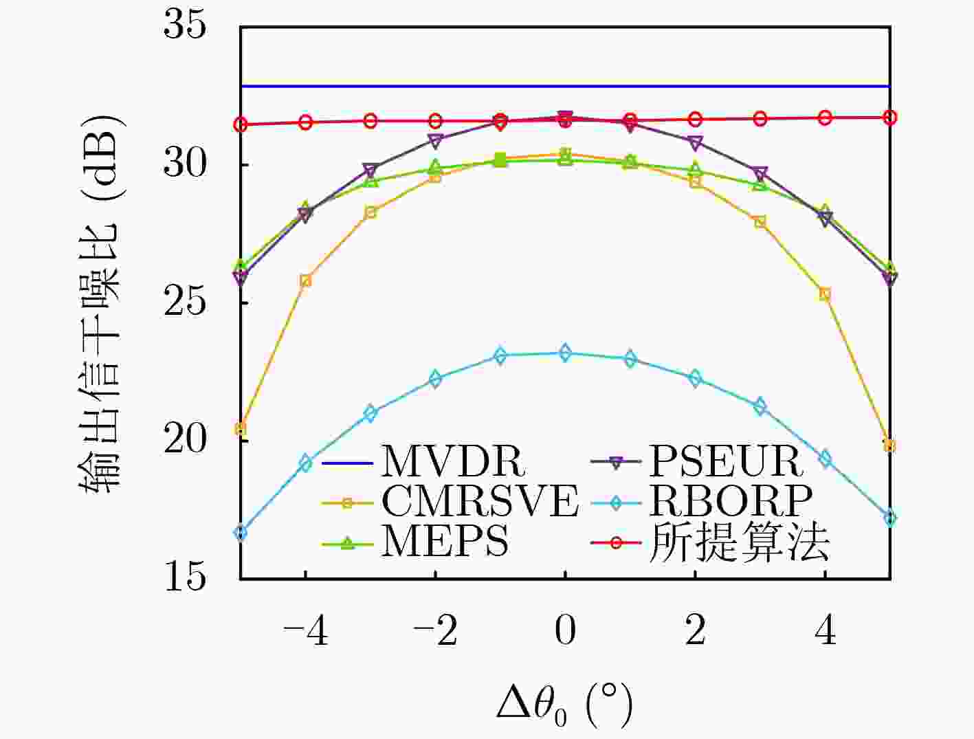 $ \boldsymbol{G}=[{\boldsymbol{u}}_{1},{\boldsymbol{u}}_{2},\cdots ,{\boldsymbol{u}}_{{{T}_{0}}}] $;5:得到正交投影矩阵$ \boldsymbol{P}_{\boldsymbol{G}}^{\bot }=\boldsymbol{I}-\boldsymbol{G}{({{\boldsymbol{G}}^{\mathrm{H}}}\boldsymbol{G})}^{-1}{\boldsymbol{G}}^{\mathrm{H}} $; 6:在期望信号角扇区$ {\varTheta }_{\text{s}} $内进行Capon功率谱积分构造矩阵$ \tilde{\boldsymbol{R}} $; 7:对矩阵$ \tilde{\boldsymbol{R}} $进行特征值分解$ \tilde{\boldsymbol{R}}=\boldsymbol{V}\boldsymbol{Z}{\boldsymbol{V}}^{\mathrm{H}} $,并估计期望信号导