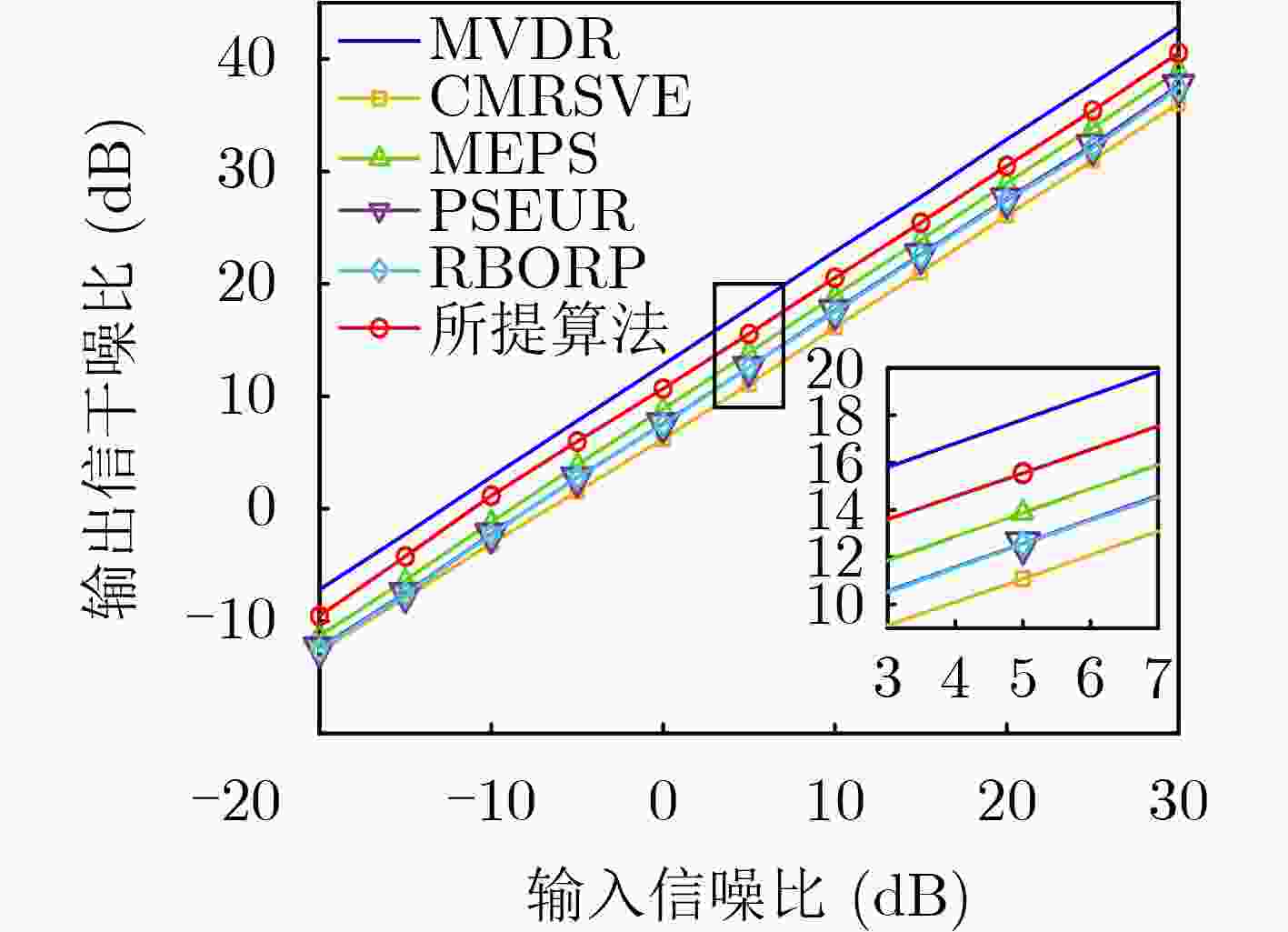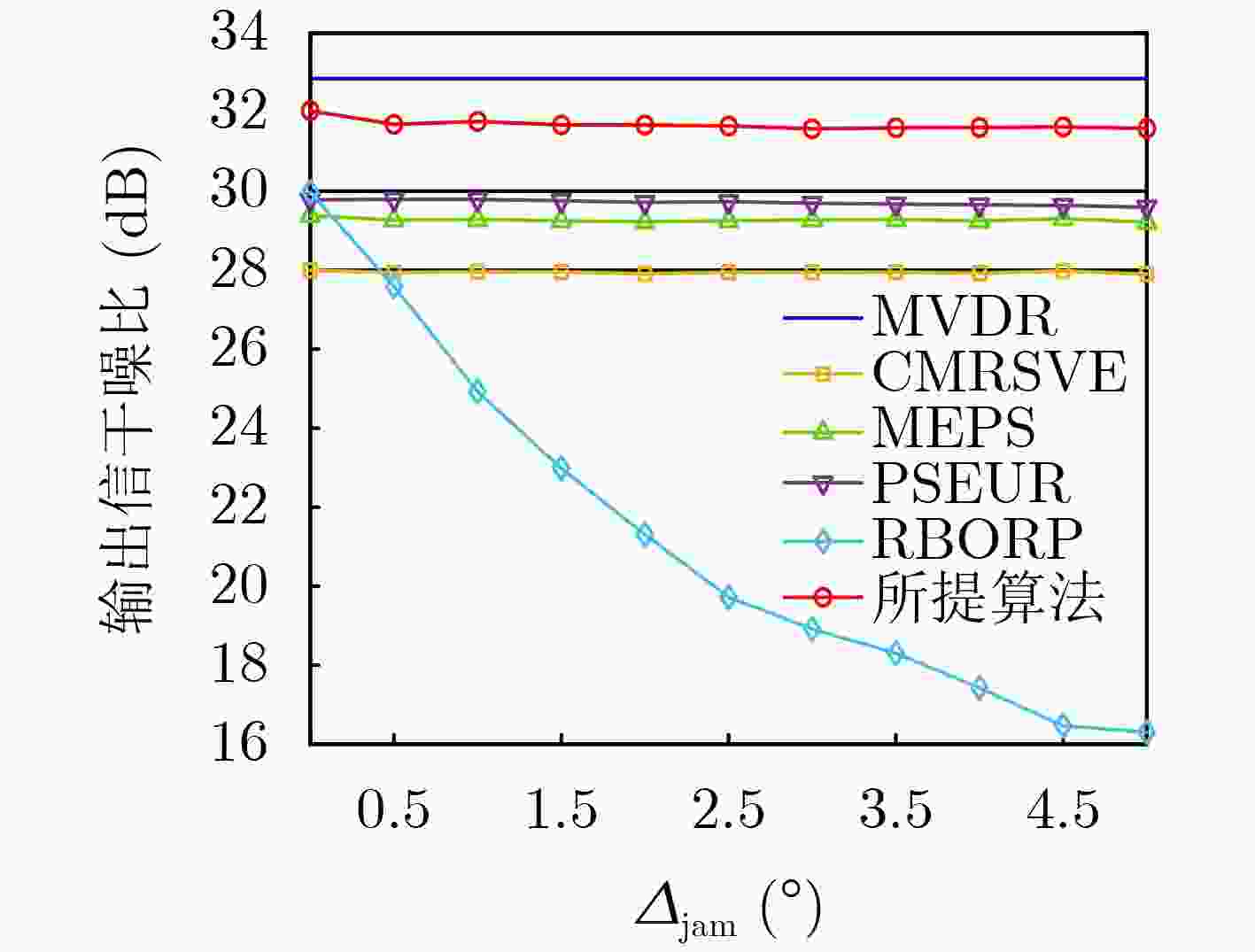 Objective In practical applications, the spatial anti-jamming performance of adaptive beamformers is often degraded by mismatches in the Directions Of Arrival (DOAs) of signals. Some robust adaptive beamforming algorithms reduce the error between the estimated signal steering vector and the actual steering vector by solving a Quadratic Constrained Quadratic Programming (QCQP) problem. This strategy significantly increases hardware cost. In addition, traditional adaptive beamforming algorithms often exhibit beampattern distortion under non-ideal conditions, such as DOA mismatch. The objective of this paper is to design a robust adaptive beamformer that effectively suppresses jamming signals under different mismatch scenarios. Methods A robust adaptive beamforming algorithm for spatial anti-jamming is proposed. First, the actual output Signal-to-Jamming-plus-Noise Ratio (SJNR) in the presence of DOA mismatch is analyzed. An ideal beamformer based on orthogonal projection is then proposed to achieve accurate beampattern control and maximize the practical output SJNR. To improve anti-jamming robustness in mismatch environments, the signal steering vector is estimated through covariance matrix construction and dominant eigenvector extraction. The beamforming weight vector is obtained by constructing an orthogonal projection matrix. Results and Discussions The proposed adaptive beamforming algorithm effectively suppresses jamming signals in mismatch environments. Numerical results show that the algorithm achieves good spatial anti-jamming performance in an ideal scenario without mismatch ( Fig. 3 ) and in a scenario with steering vector mismatch (Fig. 4 ). In DOA mismatch scenarios, the proposed algorithm demonstrates superior beampattern performance (Fig. 5 ,Fig. 6 ) and output SJNR performance (Fig. 7 ,Fig. 8 ,Fig. 9 ). The results also indicate stronger robustness to DOA mismatch (Fig. 10 ,Fig. 11 ). Effective jamming suppression is maintained even when the incoming directions of the jamming signals are closely spaced (Fig. 12 ).Conclusions This paper proposes a robust adaptive beamforming algorithm for suppressing power suppressive jamming signals. An ideal beamformer is first developed to achieve precise beampattern control and maximize the actual output SJNR. A robust adaptive beamforming algorithm is then constructed through covariance matrix construction, dominant eigenvector extraction, and orthogonal projection. Numerical results show that the proposed algorithm provides strong spatial anti-jamming performance in ideal scenarios without mismatch and in scenarios with DOA mismatch or steering vector mismatch. -