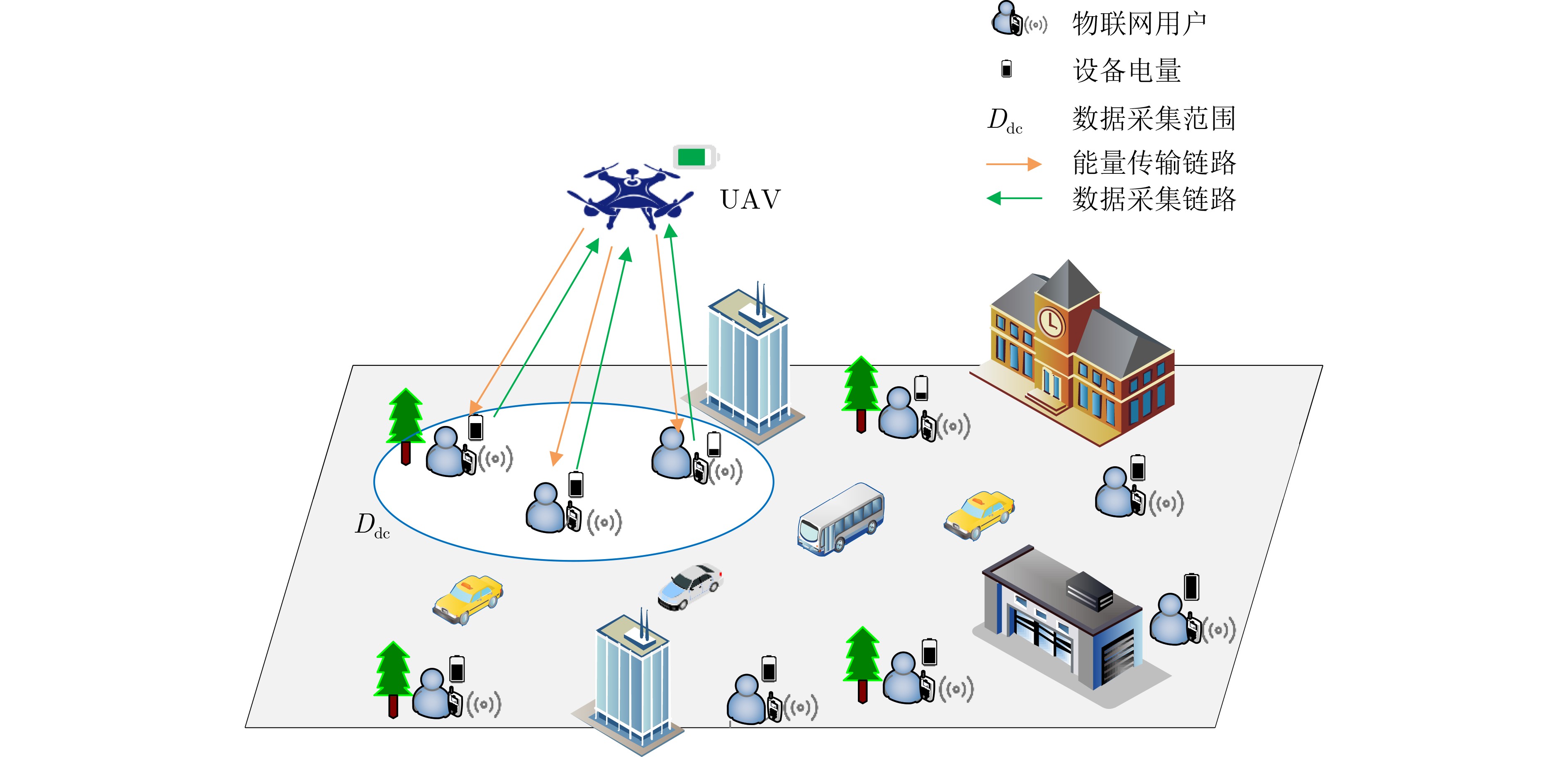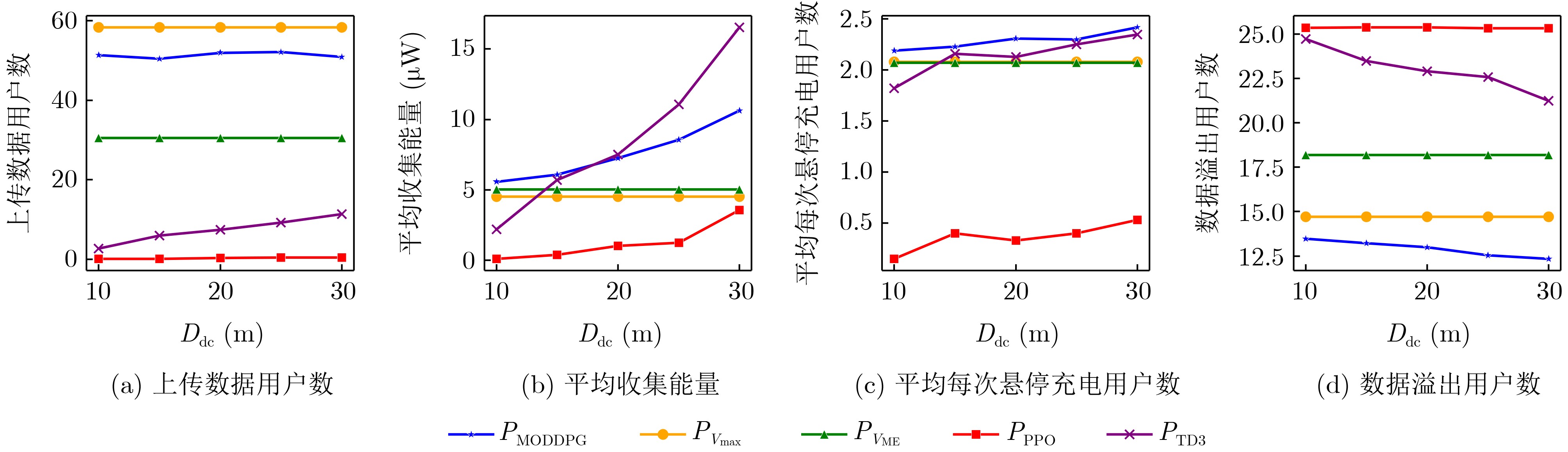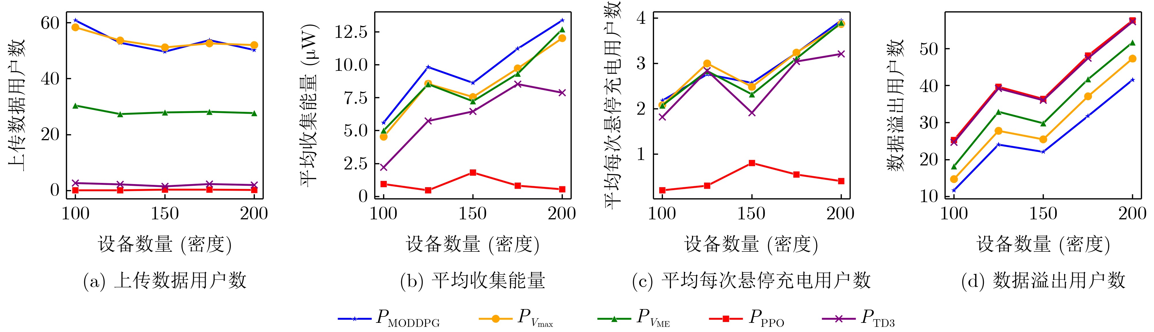 Objective With the rapid growth of data volume at the edge of the Internet of Things (IoT), traditional centralized computing architectures are inadequate to meet real-time processing requirements. Due to the limited computing and storage capabilities of IoT devices, data overflow frequently occurs when handling large volumes of information. Meanwhile, the reliance on battery power exacerbates energy shortages, further hindering continuous operation and data processing. Unmanned Aerial Vehicles (UAVs), with their flexible deployment capabilities, are increasingly being integrated into distributed computing environments to improve IoT data processing efficiency. However, the stochastic and dynamic nature of IoT user demands presents significant challenges for existing resource scheduling schemes, which struggle to effectively coordinate UAV deployments. Moreover, most studies focus on single-objective optimization, making it difficult to simultaneously balance energy harvesting, energy consumption, system latency, and data transmission rates under complex environmental conditions. To address these challenges, this paper proposes an optimization framework for a UAV-assisted, wireless-powered Mobile Edge Computing (MEC) system based on an improved Multi-Objective Deep Deterministic Policy Gradient (MODDPG) algorithm. The proposed method jointly optimizes task offloading, energy harvesting, flying energy consumption, and system latency, enhancing the overall performance and feasibility of IoT systems. Methods This paper designs a UAV-assisted, wireless-powered MEC system model, where the UAV follows a “fly-hover-communicate” protocol and operates in full-duplex mode during hovering to simultaneously perform data collection and energy transmission. The system model integrates a propulsion energy consumption model and a nonlinear energy harvesting model, formulating a multi-objective optimization problem based on task generation, energy state, and wireless channel conditions of IoT devices. To address this optimization problem, an improved MODDPG algorithm is proposed. A multi-dimensional reward function is constructed to maximize the data transmission rate and total harvested energy while minimizing system energy consumption and task offloading latency within a unified reinforcement learning framework. The agent continuously interacts with the dynamic environment to optimize the UAV’s flight trajectory, task offloading ratio, and energy transmission strategy. The proposed method is implemented and validated through extensive simulations conducted on the Python platform under various experimental settings. Results and Discussions To evaluate the performance of the proposed algorithm, comparative experiments are conducted against four other control strategies. The impact of different data collection coverage radii on the proposed strategy is analyzed (Fig. 3, Fig. 4). In terms of total data transmission rate, the \begin{document}${P_{\rm{MODDPG}}}$\end{document} strategy consistently ranks second to the maximum throughput strategy across all coverage settings, while significantly outperforming the other three strategies (Fig. 3(a)). Regarding total harvested energy, \begin{document}${P_{\rm{MODDPG}}}$\end{document} achieves the highest energy collection in all scenarios, with performance improving as the coverage radius increases (Fig. 3(b)), demonstrating its capability to enhance energy transmission coverage and system efficiency. In terms of system energy consumption, the \begin{document}${P_{{V_{\max }}}}$\end{document} strategy exhibits the highest energy usage, whereas \begin{document}${P_{\rm{MODDPG}}}$\end{document} effectively controls flight energy consumption, maintaining significantly lower energy usage compared to high-speed flying strategies (Fig. 3(c)). For average latency, \begin{document}${P_{\rm{MODDPG}}}$\end{document} achieves lower latency than the \begin{document}$P_{V_{\max}} $\end{document} strategy and the \begin{document}$P_{V_{\mathrm{ME}}} $\end{document} strategy method in most cases (Fig. 3(d)). In terms of service performance, \begin{document}${P_{\rm{MODDPG}}}$\end{document} demonstrates superior results across multiple metrics, including the number of uploading users, average harvested energy, average number of charged users per hovering instance, and the number of users experiencing data overflow, with particularly significant advantages in energy collection and reducing data overflow rates. (Fig. 4(a), Fig. 4(b), Fig. 4(c), Fig. 4(d)). In experiments with varying IoT device densities (Fig. 5, Fig. 6), \begin{document}${P_{\rm{MODDPG}}}$\end{document} exhibits strong environmental adaptability. As device density increases and resource competition intensifies, \begin{document}${P_{\rm{MODDPG}}}$\end{document} intelligently optimizes flight paths and resource scheduling, maintaining high data transmission rates and energy harvesting levels while effectively suppressing system latency and data overflow. Furthermore, simulation results under different task load scenarios (small and large tasks) (Fig. 7) indicate that \begin{document}${P_{\rm{MODDPG}}}$\end{document} can flexibly adjust its strategy based on task load variations, maximizing resource utilization. Even under heavy load conditions, the proposed algorithm maintains superior data rates, energy harvesting efficiency, and system stability, effectively coping with dynamic traffic variations. Notably, \begin{document}${P_{\rm{MODDPG}}}$\end{document} not only delivers outstanding optimization performance but also demonstrates significantly faster convergence during training compared to traditional methods such as Proximal Policy Optimization (PPO) and TD3. Overall,\begin{document}${P_{\rm{MODDPG}}}$\end{document} outperforms existing strategies in multi-objective optimization, system energy efficiency enhancement, task scheduling flexibility, and environmental adaptability. Conclusions This paper addre
