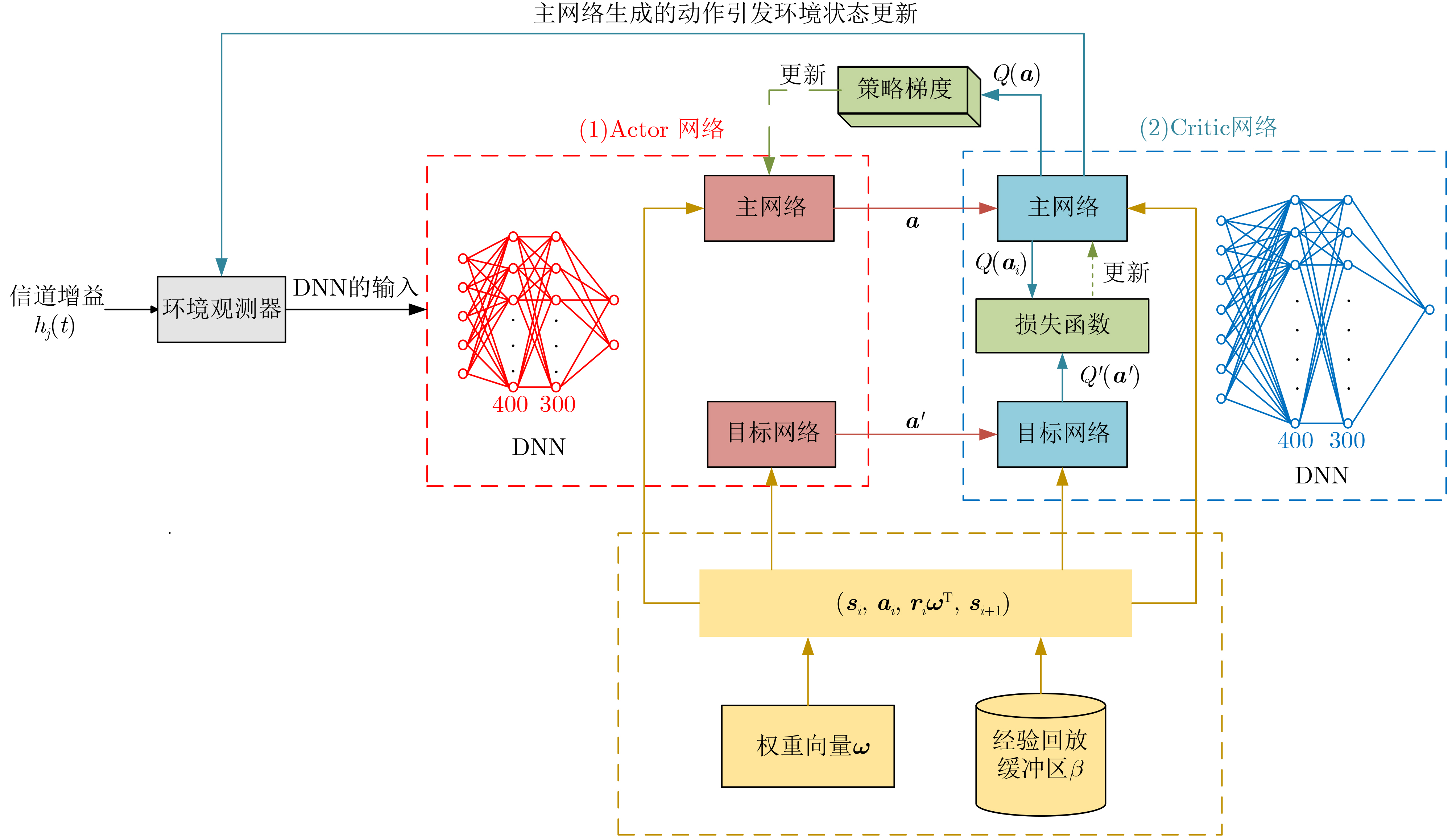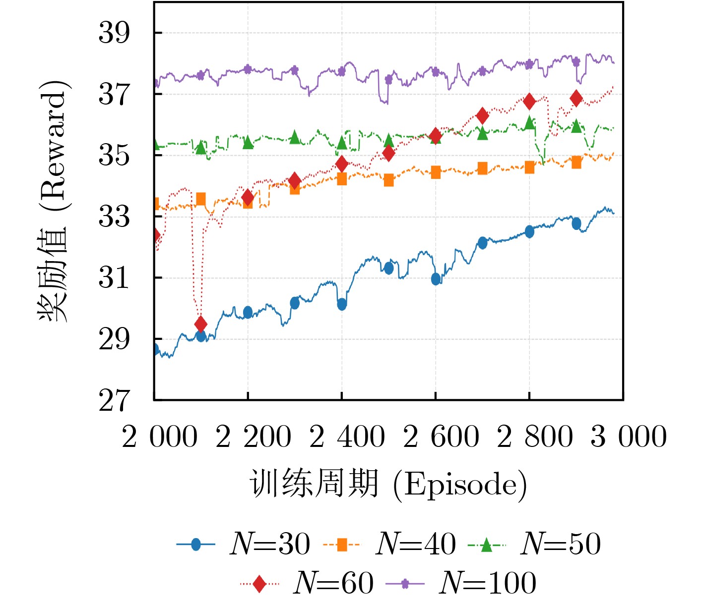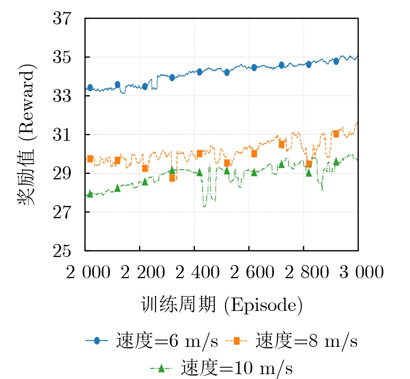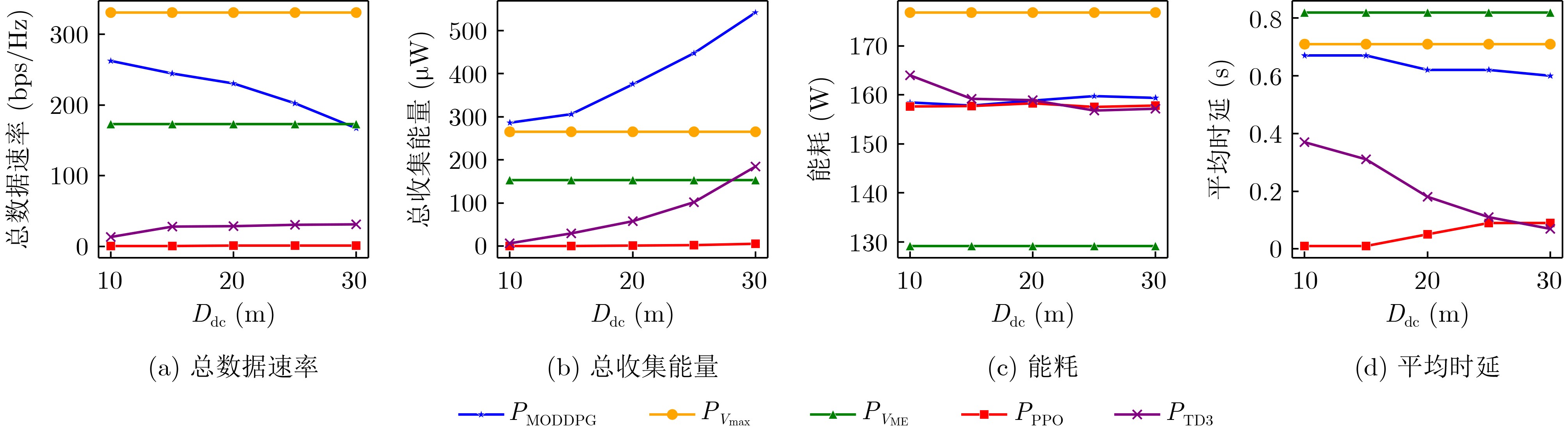 Objective With the rapid growth of data volume at the edge of the Internet of Things (IoT), traditional centralized computing architectures are inadequate to meet real-time processing requirements. Due to the limited computing and storage capabilities of IoT devices, data overflow frequently occurs when handling large volumes of information. Meanwhile, the reliance on battery power exacerbates energy shortages, further hindering continuous operation and data processing. Unmanned Aerial Vehicles (UAVs), with their flexible deployment capabilities, are increasingly being integrated into distributed computing environments to improve IoT data processing efficiency. However, the stochastic and dynamic nature of IoT user demands presents significant challenges for existing resource scheduling schemes, which struggle to effectively coordinate UAV deployments. Moreover, most studies focus on single-objective optimization, making it difficult to simultaneously balance energy harvesting, energy consumption, system latency, and data transmission rates under complex environmental conditions. To address these challenges, this paper proposes an optimization framework for a UAV-assisted, wireless-powered Mobile Edge Computing (MEC) system based on an improved Multi-Objective Deep Deterministic Policy Gradient (MODDPG) algorithm. The proposed method jointly optimizes task offloading, energy harvesting, flying energy consumption, and system latency, enhancing the overall performance and feasibility of IoT systems. Methods This paper designs a UAV-assisted, wireless-powered MEC system model, where the UAV follows a “fly-hover-communicate” protocol and operates in full-duplex mode during hovering to simultaneously perform data collection and energy transmission. The system model integrates a propulsion energy consumption model and a nonlinear energy harvesting model, formulating a multi-objective optimization problem based on task generation, energy state, and wireless channel conditions of IoT devices. To address this optimization problem, an improved MODDPG algorithm is proposed. A multi-dimensional reward function is constructed to maximize the data transmission rate and total harvested energy while minimizing system energy consumption and task offloading latency within a unified reinforcement learning framework. The agent continuously interacts with the dynamic environment to optimize the UAV’s flight trajectory, task offloading ratio, and energy transmission strategy. The proposed method is implemented and validated through extensive simulations conducted on the Python platform under various experimental settings. Results and Discussions To evaluate the performance of the proposed algorithm, comparative experiments are conducted against four other control strategies. The impact of different data collection coverage radii on the proposed strategy is analyzed (Fig. 3, Fig. 4). In terms of total data transmission rate, the \begin{document}${P_{\rm{MODDPG}}}$\end{document} strategy consistently ranks second to the maximum throughput strategy across all coverage settings, while significantly outperforming the other three strategies (Fig. 3(a)). Regarding total harvested energy, \begin{document}${P_{\rm{MODDPG}}}$\end{document} achieves the highest energy collection in all scenarios, with performance improving as the coverage radius increases (Fig. 3(b)), demonstrating its capability to enhance energy transmission coverage and system efficiency. In terms of system energy consumption, the \begin{document}${P_{{V_{\max }}}}$\end{document} strategy exhibits the highest energy usage, whereas \begin{document}${P_{\rm{MODDPG}}}$\end{document} effectively controls flight energy consumption, maintaining significantly lower energy usage compared to high-speed flying strategies (Fig. 3(c)). For average latency, \begin{document}${P_{\rm{MODDPG}}}$\end{document} achieves lower latency than the \begin{document}$P_{V_{\max}} $\end{document} strategy and the \begin{document}$P_{V_{\mathrm{ME}}} $\end{document} strategy method in most cases (Fig. 3(d)). In terms of service performance, \begin{document}${P_{\rm{MODDPG}}}$\end{document} demonstrates superior results across multiple metrics, including the number of uploading users, average harvested energy, average number of charged users per hovering instance, and the number of users experiencing data overflow, with particularly significant advantages in energy collection and reducing data overflow rates. (Fig. 4(a), Fig. 4(b), Fig. 4(c), Fig. 4(d)). In experiments with varying IoT device densities (Fig. 5, Fig. 6), \begin{document}${P_{\rm{MODDPG}}}$\end{document} exhibits strong environmental adaptability. As device density increases and resource competition intensifies, \begin{document}${P_{\rm{MODDPG}}}$\end{document} intelligently optimizes flight paths and resource scheduling, maintaining high data transmission rates and energy harvesting levels while effectively suppressing system latency and data overflow. Furthermore, simulation results under different task load scenarios (small and large tasks) (Fig. 7) indicate that \begin{document}${P_{\rm{MODDPG}}}$\end{document} can flexibly adjust its strategy based on task load variations, maximizing resource utilization. Even under heavy load conditions, the proposed algorithm maintains superior data rates, energy harvesting efficiency, and system stability, effectively coping with dynamic traffic variations. Notably, \begin{document}${P_{\rm{MODDPG}}}$\end{document} not only delivers outstanding optimization performance but also demonstrates significantly faster convergence during training compared to traditional methods such as Proximal Policy Optimization (PPO) and TD3. Overall,\begin{document}${P_{\rm{MODDPG}}}$\end{document} outperforms existing strategies in multi-objective optimization, system energy efficiency enhancement, task scheduling flexibility, and environmental adaptability. Conclusions This paper addre