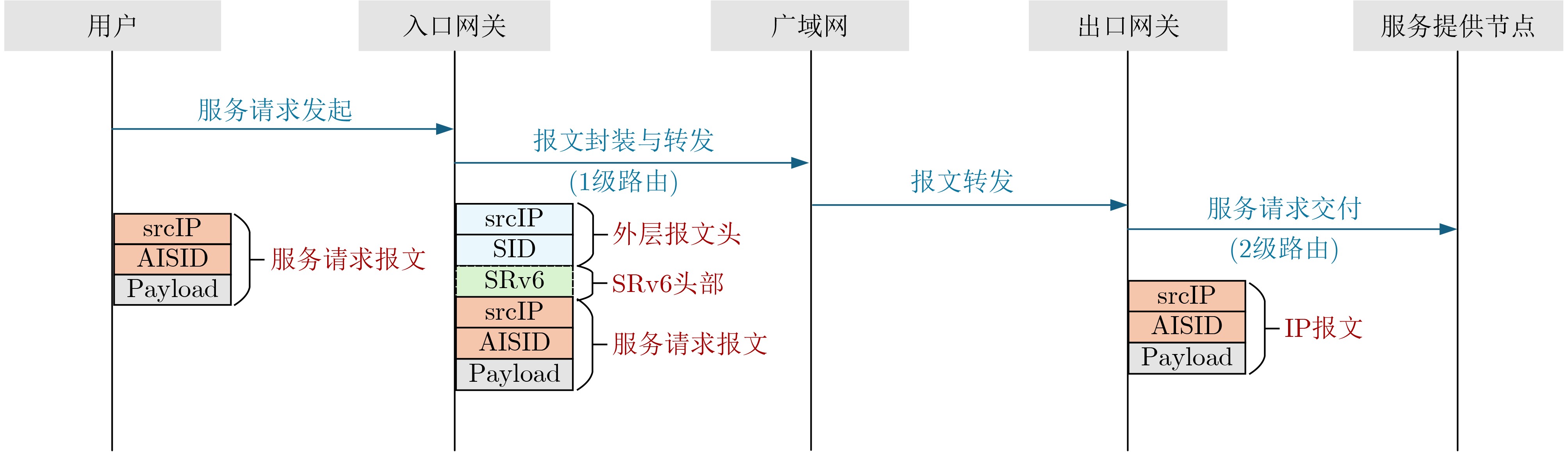 Objective   The rapid expansion of Artificial Intelligence (AI) computing services has heightened the demand for flexible access and efficient utilization of computing resources. Traditional Domain Name System (DNS) and IP-based scheduling mechanisms are constrained in addressing the stringent requirements of low latency and high concurrency, highlighting the need for integrated computing-network resource management. To address these challenges, this study proposes a lightweight deployment framework that enhances network adaptability and resource scheduling efficiency for AI services.  Methods   The AI-oriented Service IDentifier (AISID) is designed to encode service attributes into four dimensions: Object, Function, Method, and Performance. Service requests are decoupled from physical resource locations, enabling dynamic resource matching. AISID is embedded within IPv6 packets (Fig. 5), consisting of a 64-bit prefix for identification and a 64-bit service-specific suffix (Fig. 4). A lightweight incremental deployment scheme is implemented through hierarchical routing, in which stable wide-area routing is managed by ingress gateways, and fine-grained local scheduling is handled by egress gateways (Fig. 6). Ingress and egress gateways are incrementally deployed under the coordination of an intelligent control system to optimize resource allocation. AISID-based paths are encapsulated at ingress gateways using Segment Routing over IPv6 (SRv6), whereas egress gateways select optimal service nodes according to real-time load data using a weighted least-connections strategy (Fig. 8). AISID lifecycle management includes registration, query, migration, and decommissioning phases (Table 2), with global synchronization maintained by the control system. Resource scheduling is dynamically adjusted according to real-time network topology and node utilization metrics (Fig. 7).  Results and Discussions   Experimental results show marked improvements over traditional DNS/IP architectures. The AISID mechanism reduces service request initiation latency by 61.3% compared to DNS resolution (Fig. 9), as it eliminates the need for round-trip DNS queries. Under 500 concurrent requests, network bandwidth utilization variance decreases by 32.8% (Fig. 10), reflecting the ability of AISID-enabled scheduling to alleviate congestion hotspots. Computing resource variance improves by 12.3% (Fig. 11), demonstrating more balanced workload distribution across service nodes. These improvements arise from AISID’s precise semantic matching in combination with the hierarchical routing strategy, which together enhance resource allocation efficiency while maintaining compatibility with existing IPv6/DNS infrastructure (Fig. 2, Fig. 3). The incremental deployment approach further reduces disruption to legacy networks, confirming the framework’s practicality and viability for real-world deployment.  Conclusions   This study establishes a computing-network convergence framework for AI services based on semantic-driven AISID and lightweight deployment. The key innovations include AISID’s semantic encoding, which enables dynamic resource scheduling and decoupled service access, together with incremental gateway deployment that optimizes routing without requiring major modifications to legacy networks. Experimental validation demonstrates significant improvements in latency reduction, bandwidth efficiency, and balanced resource utilization. Future research will explore AISID’s scalability across heterogeneous domains and its robustness under dynamic network conditions.