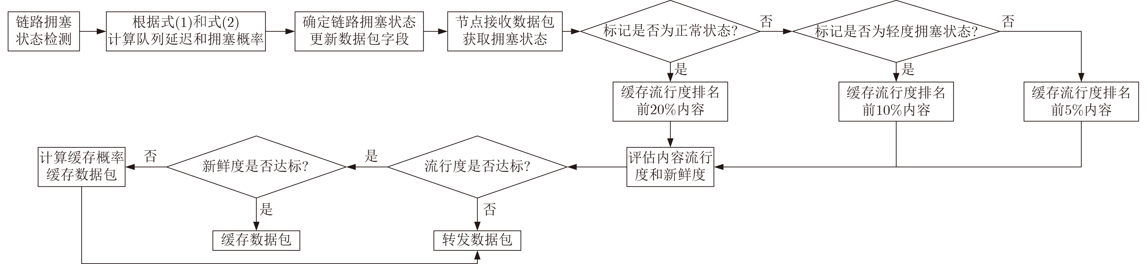 Objective Low Earth Orbit (LEO) satellite networks are central to future space-air-ground integrated systems, offering global coverage and low-latency communication. However, their high-speed mobility leads to rapidly changing topologies, and strict onboard cache constraints hinder efficient content delivery. Existing caching strategies often overlook real-time network congestion and content attributes (e.g., freshness), which leads to inefficient resource use and degraded Quality of Service (QoS). To address these limitations, we propose an adaptive cache placement strategy based on congestion awareness. The strategy dynamically couples real-time network conditions, including link congestion and latency, with a content value assessment model that incorporates both popularity and freshness.This integrated approach enhances cache hit rates, reduces backhaul load, and improves user QoS in highly dynamic LEO satellite environments, enabling efficient content delivery even under fluctuating traffic demands and resource constraints. Methods The proposed strategy combines a dual-threshold congestion detection mechanism with a multi-dimensional content valuation model. It proceeds in three steps. First, satellite nodes monitor link congestion in real time using dual latency thresholds and relay congestion status to downstream nodes through data packets. Second, a two-dimensional content value model is constructed that integrates popularity and freshness. Popularity is updated dynamically using an Exponential Weighted Moving Average (EWMA), which balances historical and recent request patterns to capture temporal variations in demand. Freshness is evaluated according to the remaining data lifetime, ensuring that expired or near-expired content is deprioritized to maintain cache efficiency and relevance. Third, caching thresholds are adaptively adjusted according to congestion level, and a hop count control factor is introduced to guide caching decisions. This coordinated mechanism enables the system to prioritize high-value content while mitigating congestion, thereby improving overall responsiveness and user QoS. Results and Discussions Simulations conducted on ndnSIM demonstrate the superiority of the proposed strategy over PaCC (Popularity-Aware Closeness-based Caching), LCE (Leave Copy Everywhere), LCD (Leave Copy Down), and Prob (probability-based caching with probability = 0.5). The key findings are as follows. (1) Cache hit rate. The proposed strategy consistently outperforms conventional methods. As shown in Fig. 8, the cache hit rate rises markedly with increasing cache capacity and Zipf parameter, exceeding those of LCE, LCD, and Prob. Specifically, the proposed strategy achieves improvements of 43.7% over LCE, 25.3% over LCD, 17.6% over Prob, and 9.5% over PaCC. Under high content concentration (i.e., larger Zipf parameters), the improvement reaches 29.1% compared with LCE, highlighting the strong capability of the strategy in promoting high-value content distribution. (2) Average routing hop ratio. The proposed strategy also reduces routing hops compared with the baselines. As shown in Fig. 9, the average hop ratio decreases as cache capacity and Zipf parameter increase. Relative to PaCC, the proposed strategy lowers the average hop ratio by 2.24%, indicating that content is cached closer to users, thereby shortening request paths and improving routing efficiency. (3) Average request latency. The proposed strategy achieves consistently lower latency than all baseline methods. As summarized in Table 2 and Fig. 10, the reduction is more pronounced under larger cache capacities and higher Zipf parameters. For instance, with a cache capacity of 100 MB, latency decreases by approximately 2.9%, 5.8%, 9.0%, and 10.3% compared with PaCC, Prob, LCD, and LCE, respectively. When the Zipf parameter is 1.0, latency reductions reach 2.7%, 5.7%, 7.2%, and 8.8% relative to PaCC, Prob, LCD, and LCE, respectively. Concretely, under a cache capacity of 100 MB and Zipf parameter of 1.0, the average request latency of the proposed strategy is 212.37 ms, compared with 236.67 ms (LCE), 233.45 ms (LCD), 225.42 ms (Prob), and 218.62 ms (PaCC). Conclusions This paper presents a congestion-aware adaptive caching placement strategy for LEO satellite networks. By combining real-time congestion monitoring with multi-dimensional content valuation that considers both dynamic popularity and freshness, the strategy achieves balanced improvements in caching efficiency and network stability. Simulation results show that the proposed method markedly enhances cache hit rates, reduces average routing hops, and lowers request latency compared with existing schemes such as PaCC, Prob, LCD, and LCE. These benefits hold across different cache sizes and request distributions, particularly under resource-constrained or highly dynamic conditions, confirming the strategy’s adaptability to LEO environments. The main innovations include a closed-loop feedback mechanism for congestion status, dynamic adjustment of caching thresholds, and hop-aware content placement, which together improve resource utilization and user QoS. This work provides a lightweight and robust foundation for high-performance content delivery in satellite-terrestrial integrated networks. Future extensions will incorporate service-type differentiation (e.g., delay-sensitive vs. bandwidth-intensive services), and orbital prediction to proactively optimize cache migration and updates, further enhancing efficiency and adaptability in 6G-enabled LEO networks.
