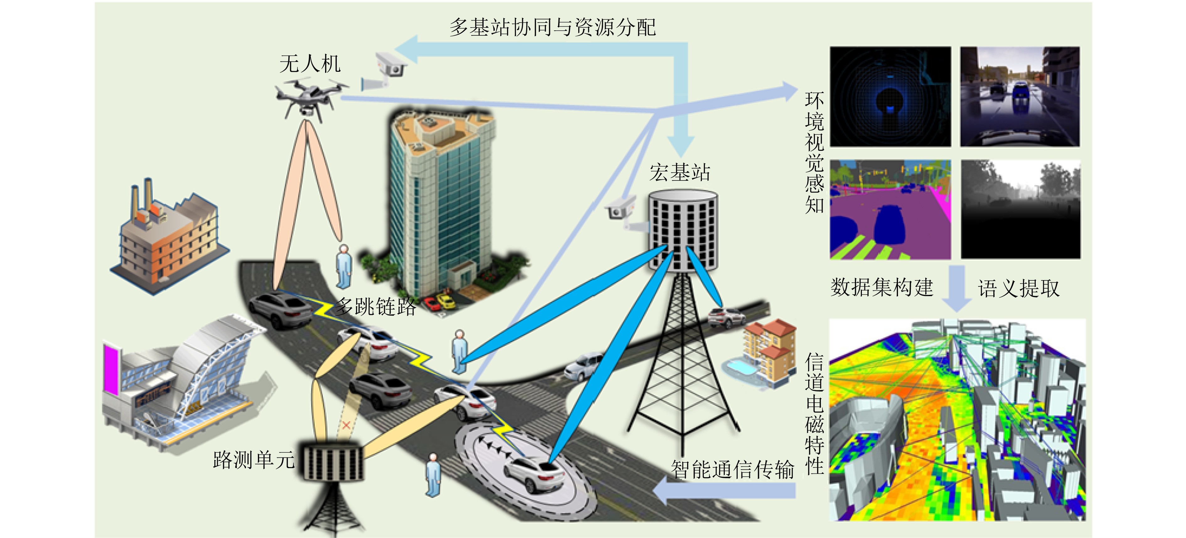 Objective  Integrated Sensing And Communications (ISAC) is regarded as a key enabling technology for Sixth-Generation mobile communications (6G), as it simultaneously senses and monitors information in the physical world while maintaining communication with users. The technology supports emerging scenarios such as low-altitude economy, digital twin systems, and vehicle networking. Current ISAC research primarily concentrates on wireless devices that include base stations and terminals. Visual sensing, which provides strong visibility and detailed environmental information, has long been a major research direction in computer science. This study proposes the integration of visual sensing with wireless-device sensing to construct a multimodal ISAC system. In this system, visual sensing captures environmental information to assist wireless communications, and wireless signals help overcome limitations inherent to visual sensing.  Methods  The study first explores the correlation mechanism between environmental vision and wireless communications. Key algorithms for visual-sensing-assisted wireless communication are then discussed, including beam prediction, occlusion prediction, and resource scheduling and allocation methods for multiple base stations and users. These schemes demonstrate that visual sensing, used as prior information, enhances the communication performance of the multimodal ISAC system. The sensing gains provided by wireless devices combined with visual sensors are subsequently explored. A static-environment reconstruction scheme and a dynamic-target sensing scheme based on wireless-visual fusion are proposed to obtain global information about the physical world. In addition, a “vision-communication” simulation and measurement dataset is constructed, establishing a complete theoretical and technical framework for multimodal ISAC.  Results and Discussions  For visual-sensing-assisted wireless communications, the hardware prototype system constructed in this study is shown in (Fig. 6) and (Fig. 7), and the corresponding hardware test results are presented in (Table 1). The results show that visual sensing assists millimetre-wave communications in performing beam alignment and beam prediction more effectively, thereby improving system communication performance. For wireless-communication-assisted sensing, the hardware prototype system is shown in (Fig. 8), and the experimental results are shown in (Fig. 9) and (Table 2). The static-environment reconstruction obtained through wireless-visual fusion shows improved robustness and higher accuracy. Depth estimation based on visual and communication fusion also presents strong robustness in rainy and snowy weather, with the RMSE reduced by approximately 50% compared with pure visual algorithms. These experimental results indicate that vision-enabled multimodal ISAC systems present strong potential for practical application.  Conclusions  A multimodal ISAC system that integrates visual sensing with wireless-device sensing is proposed. In this system, visual sensing captures environmental information to assist wireless communications, and wireless signals help overcome the inherent limitations of visual sensing. Key algorithms for visual-sensing-assisted wireless communication are examined, including beam prediction, occlusion prediction, and resource scheduling and allocation for multiple base stations and users. The sensing gains brought by wireless devices combined with visual sensors are also analysed. Static-environment reconstruction and dynamic-target sensing schemes based on wireless-visual fusion are proposed to obtain global information about the physical world. A “vision-communication” simulation and measurement dataset is further constructed, forming a coherent theoretical and technical framework for multimodal ISAC. Experimental results show that vision-enabled multimodal ISAC systems present strong potential for use in 6G networks.