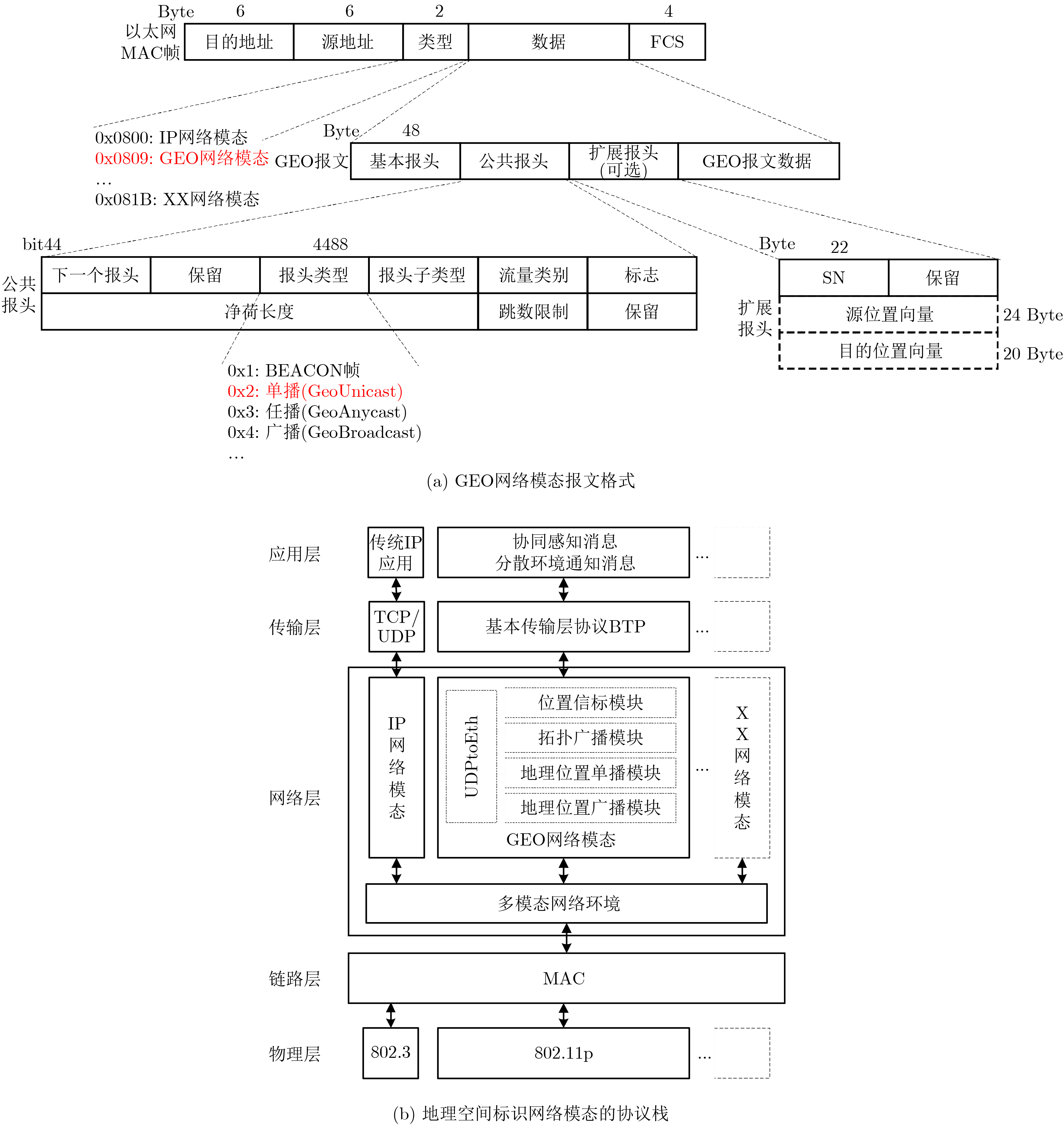 Objective  Vehicle-infrastructure cooperative Networks (V2X)are open and contain large numbers of nodes with high mobility, frequent topology changes, unstable wireless channels, and varied service requirements. These characteristics create challenges to efficient data transmission. A flexible network that supports rapid reconfiguration to meet different service requirements is considered essential in Intelligent Transportation Systems (ITS). With the development of programmable network technologies, programmable data-plane techniques are shifting the architecture from rigid designs to adaptive and flexible systems. In this work, a protocol standard based on geospatial information is proposed and combined with a polymorphic network architecture to design a geospatial identifier network modal. In this modal, the traditional three-layer protocol structure is replaced by packet forwarding based on geospatial identifiers. Packets carry geographic location information, and forwarding is executed directly according to this information. Addressing and routing based on geospatial information are more efficient and convenient than traditional IP-based approaches. A vehicle-infrastructure cooperative traffic system based on geospatial identifiers is further designed for intelligent transportation scenarios. This system supports direct geographic forwarding for road safety message dissemination and traffic information exchange. It enhances safety and improves route-planning efficiency within V2X.  Methods  The geospatial identifier network modal is built on a protocol standard that uses geographic location information and a flexible polymorphic network architecture. In this design, the traditional IP addressing mechanism in the three-layer network is replaced by a geospatial identifier protocol, and addressing and routing are executed on programmable polymorphic network elements. To support end-to-end transmission, a protocol stack for the geospatial identifier network modal is constructed, enabling unified transmission across different network modals. A dynamic geographic routing mechanism is further developed to meet the transmission requirements of the GEO modal. This mechanism functions in a multimodal network controller and uses the relatively stable coverage of roadside base stations to form a two-level mapping: “geographic region-base station/geographic coordinates-terminal.” This mapping supports precise path matching for GEO modal packets and enables flexible, centrally controlled geographic forwarding. To verify the feasibility of the geospatial identifier network modal, a vehicle-infrastructure cooperative intelligent transportation system supporting geospatial identifier addressing is developed. The system is designed to facilitate efficient dissemination of road safety and traffic information. The functional requirements of the system are analyzed, and the business processing flow and overall architecture are designed. Key hardware and software modules are also developed, including the geospatial representation data-plane code, traffic control center services, roadside base stations, and in-vehicle terminals, and their implementation logic is presented.  Results and Discussions  System evaluation is carried out from four aspects: evaluation environment, operational effectiveness, theoretical analysis, and performance testing. A prototype intelligent transportation system is deployed, as shown in Figure 7 and Figure 8. The prototype demonstrates correct message transmission based on the geospatial identifier modal. A typical vehicle-to-vehicle communication case is used to assess forwarding efficiency, where an onboard terminal (T3) sends a road-condition alert (M) to another terminal (T2). Sequence-based analysis is applied to compare forwarding performance between the GEO modal and a traditional IP protocol. Theoretical analysis indicates that the GEO modal provides higher forwarding efficiency, as shown in Fig. 9. Additional performance tests are conducted by adjusting the number of terminals (Fig. 10), background traffic (Fig. 11), and the traffic of the control center (Fig. 12) to observe the transmission behavior of geospatial identifier packets. The results show that the intelligent transportation system maintains stable and efficient transmission performance under varying network conditions. System evaluation confirms its suitability for typical vehicle-infrastructure cooperative communication scenarios, supporting massive connectivity and elastic traffic loads.  Conclusions  By integrating a flexible polymorphic network architecture with a protocol standard based on geographic information, a geospatial identifier network modal is developed and implemented. The modal enables direct packet forwarding based on geospatial location. A prototype vehicle-infrastructure cooperative intelligent transportation system using geospatial identifier addressing is also designed for intelligent transportation scenarios. The system supports applications such as road-safety alerts and traffic information broadcasting, improves vehicle safety, and enhances route-planning efficiency. Experimental evaluation shows that the system maintains stable and efficient performance under typical traffic conditions, including massive connectivity, fluctuating background traffic, and elastic service loads. With the continued development of vehicular networking technologies, the proposed system is expected to support broader intelligent transportation applications and contribute to safer and more efficient mobility systems.